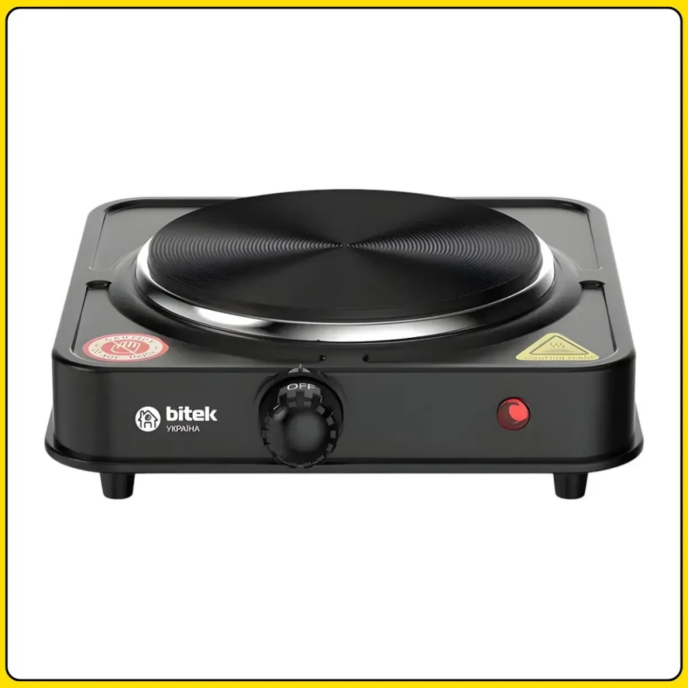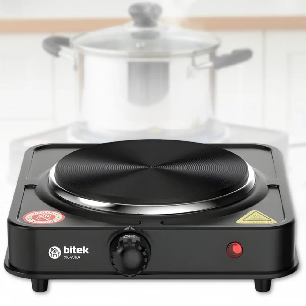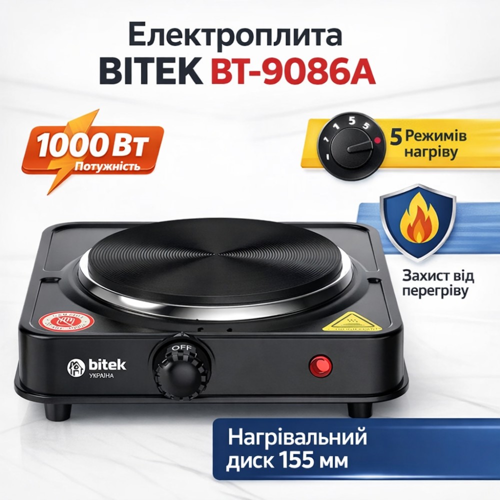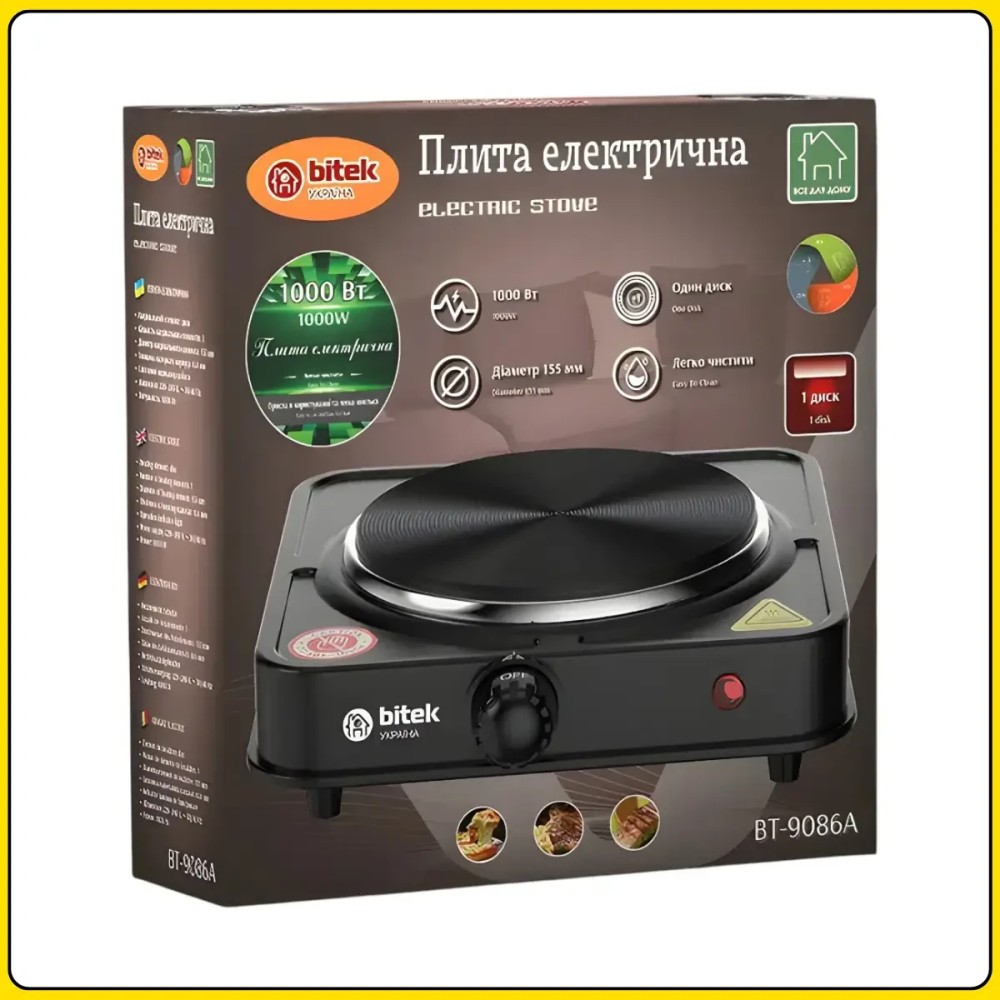 Електрична настільна плита на 1 конфорку з дисковим нагрівачем 155 мм BITEK BT-9086A 1000W Настільна електрична плита BITEK BT-9086A з одним нагрівальним диском призначена для приготування й розігрівання їжі в домашніх умовах, на дачі, в офісі або гуртожитку. Компактний формат і класичний чорний колір роблять плиту зручною для розміщення на будь-якій кухонній поверхні без потреби складного монтажу. Дисковий нагрівальний елемент діаметром 155 мм забезпечує рівномірне нагрівання посуду та стабільну роботу. Плита обладнана термостатом і п'ятьма температурними режимами, що дає змогу точно регулювати процес приготування різних страв. Захист від перегрівання підвищує безпеку експлуатації, а світловий індикатор наочно показує стан роботи пристрою. Живлення від стандартної мережі 220-240 В робить модель універсальною та простою у використанні. Переваги: Компактний розмір: зручно розміщується на столі та не займає багато місця Потужність 1000 Вт: швидке нагрівання та стабільна робота Дисковий нагрівальний елемент: рівномірний розподіл тепла П'ять температурних режимів: точне настроювання під різні страви Вбудований термостат: підтримання заданої температури Захист від перегрівання: безпечна експлуатація Світловий індикатор роботи: візуальний контроль увімкнення Характеристики: Тип плити: настільна електрична Тип нагрівального елемента: диск Кількість конфорок: 1 Діаметр нагрівального елемента: 155 мм Розмір конфорки: 150 мм Потужність: 1000 Вт Кількість температурних режимів: 5 Термостат: є Індикатор роботи: світловий Захист від перегрівання: є Матеріал корпусу: метал Товщина корпусу: 0,4 мм Цвет: чорний Живлення: 220-240 В Частота сети: 50/60 Гц Розмір: 21х21х5 см