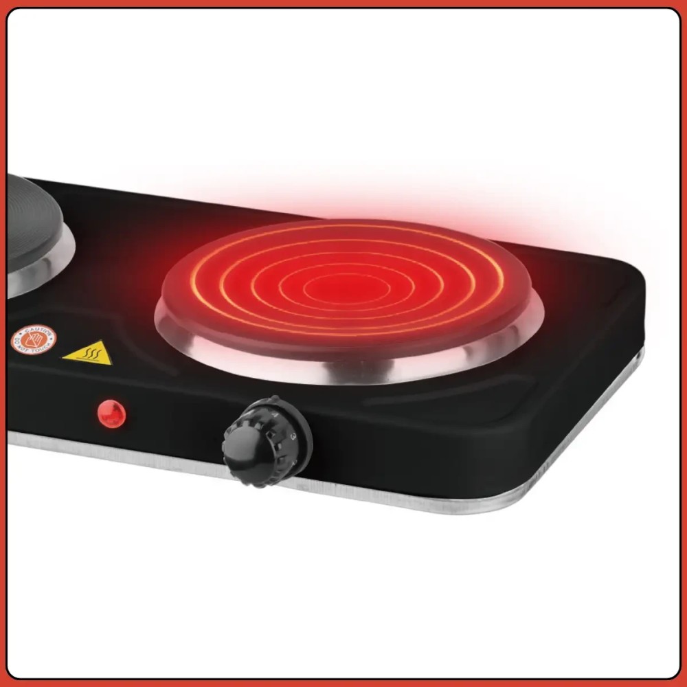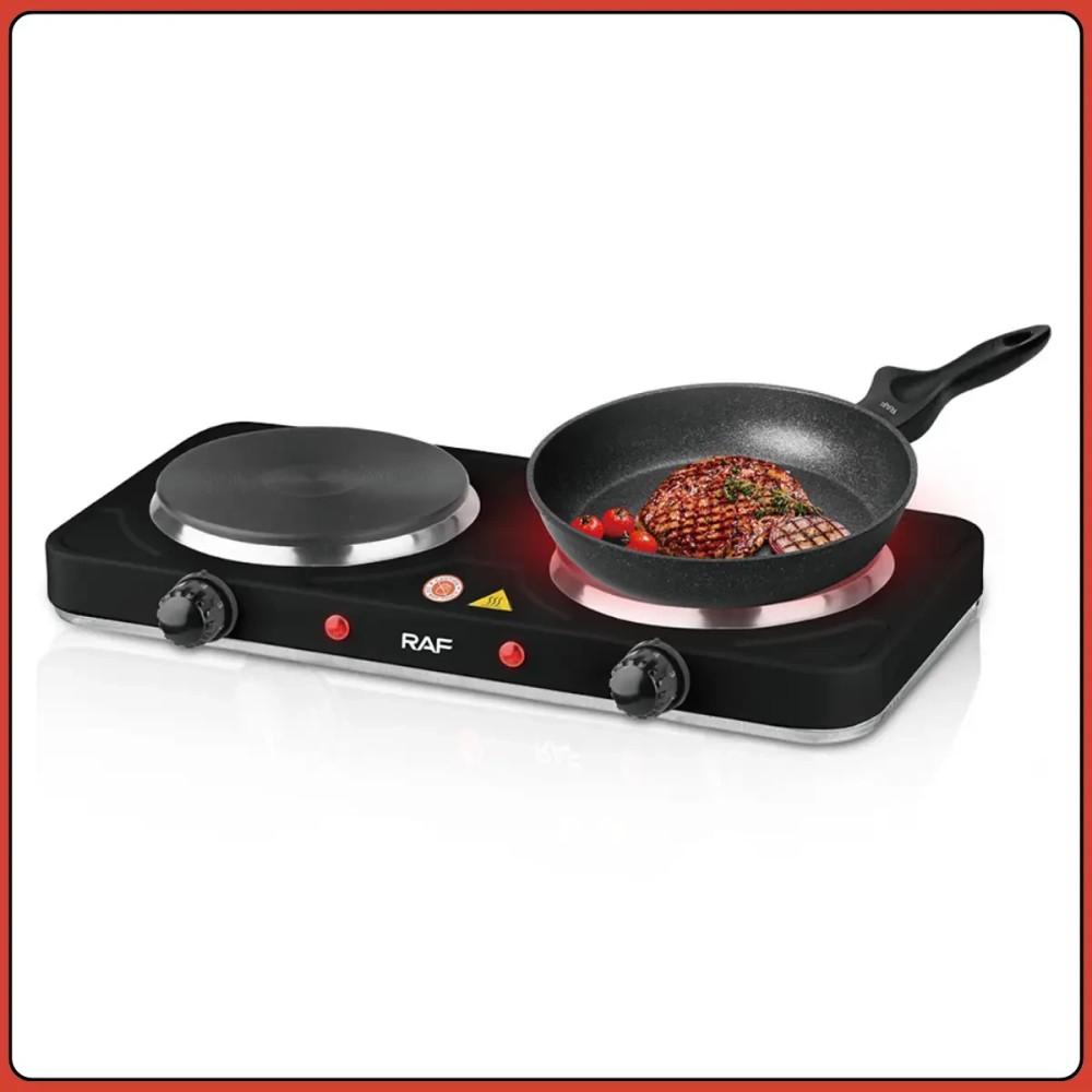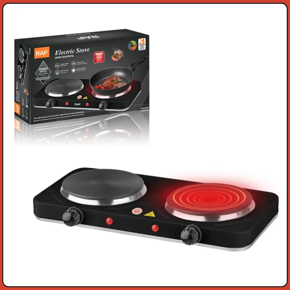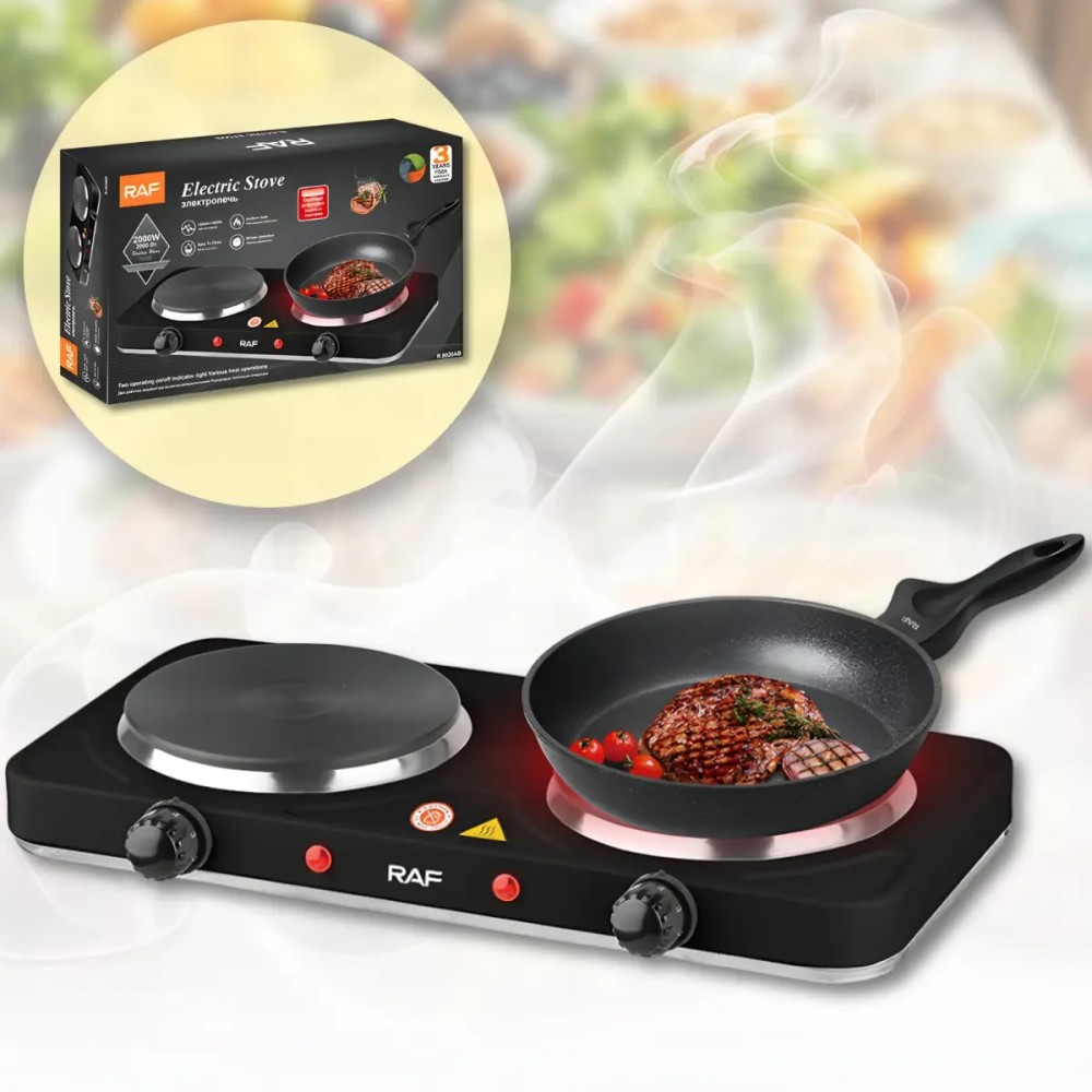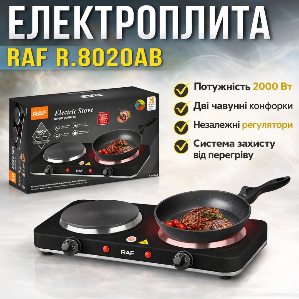 Електрична плита з чавунними дисковими нагрівачами RAF R.8020AB 2000W Електрична плита RAF R.8020AB оснащена двома конфорками з чавунними дисковими нагрівачами, які забезпечують рівномірний розподіл тепла та тривале збереження температури. Загальна потужність пристрою становить 2000 Вт, по 1000 Вт на кожну конфорку, що дозволяє готувати або розігрівати кілька страв одночасно. Компактний корпус допомагає ефективно організувати робочий простір та робить плиту зручною для використання. Керування плитою здійснюється за допомогою двох незалежних поворотних перемикачів, що дозволяє окремо регулювати температуру кожної конфорки. Вбудована система захисту від перегріву та два світлові індикатори включення та вимикання підвищують безпеку експлуатації. Пристрій оснащений стійкими гумовими ніжками, які запобігають ковзанню та захищають поверхню столу від перегріву. Переваги: Дві конфорки: одночасне приготування кількох страв Потужність 2000 Вт: швидке нагрівання Особливе управління: незалежні регулятори температури Чавунні нагрівачі: рівномірний розподіл тепла Світлові індикатори: контроль роботи плити Захист від перегріву: безпечна експлуатація Компактний корпус: економія місця на кухні Прогумовані ніжки: стійкість та захист поверхні Характеристики: Тип плити: електрична Модель: RAF R.8020AB Кількість конфорок: 2 Тип нагрівача: чавунний диск Загальна потужність: 2000 Вт Потужність однієї конфорки: 1000 Вт Напруга: 220-240 В Частота: 50-60 Гц Колір корпусу: чорний Розміри: 40×20×6 см Тип управління: механічне, поворотні перемикачі Індикатори роботи: 2 Система захисту від перегріву: є Матеріал корпусу: метал Ніжки: гумові