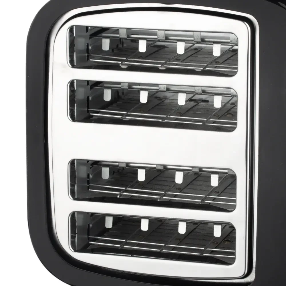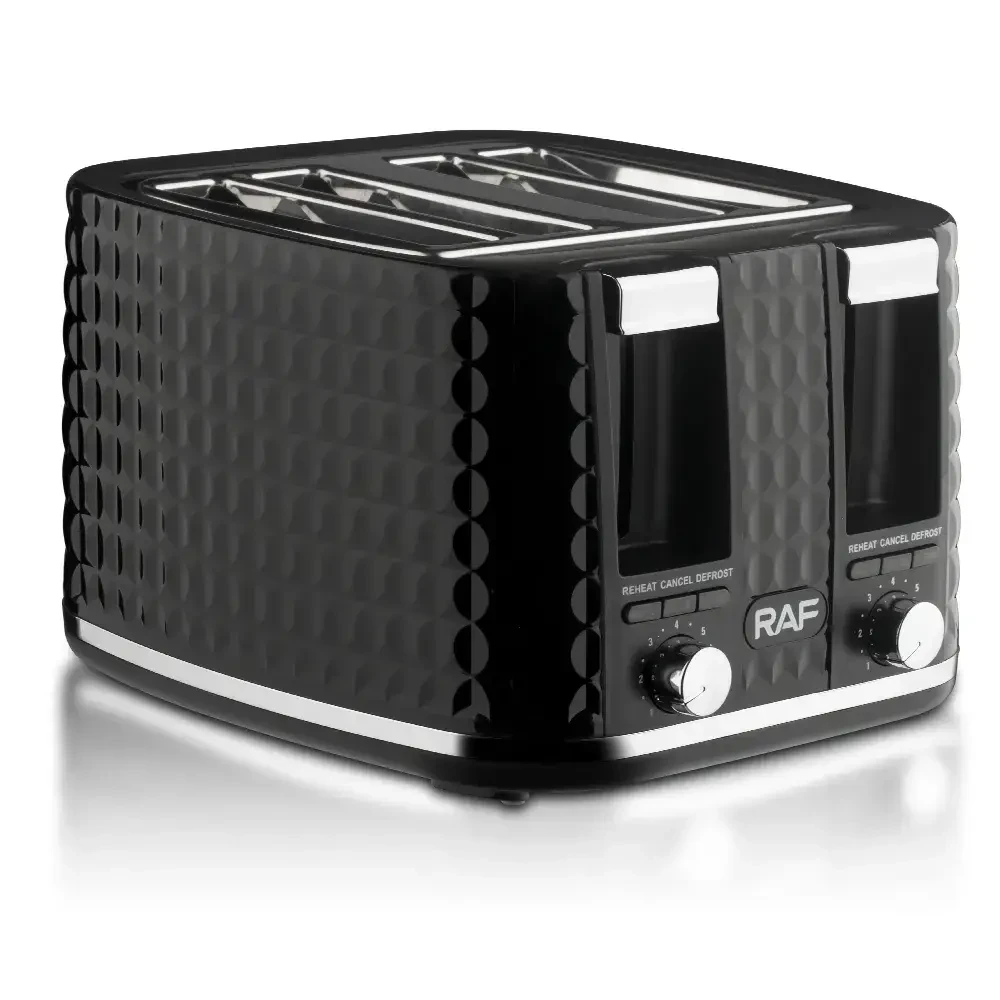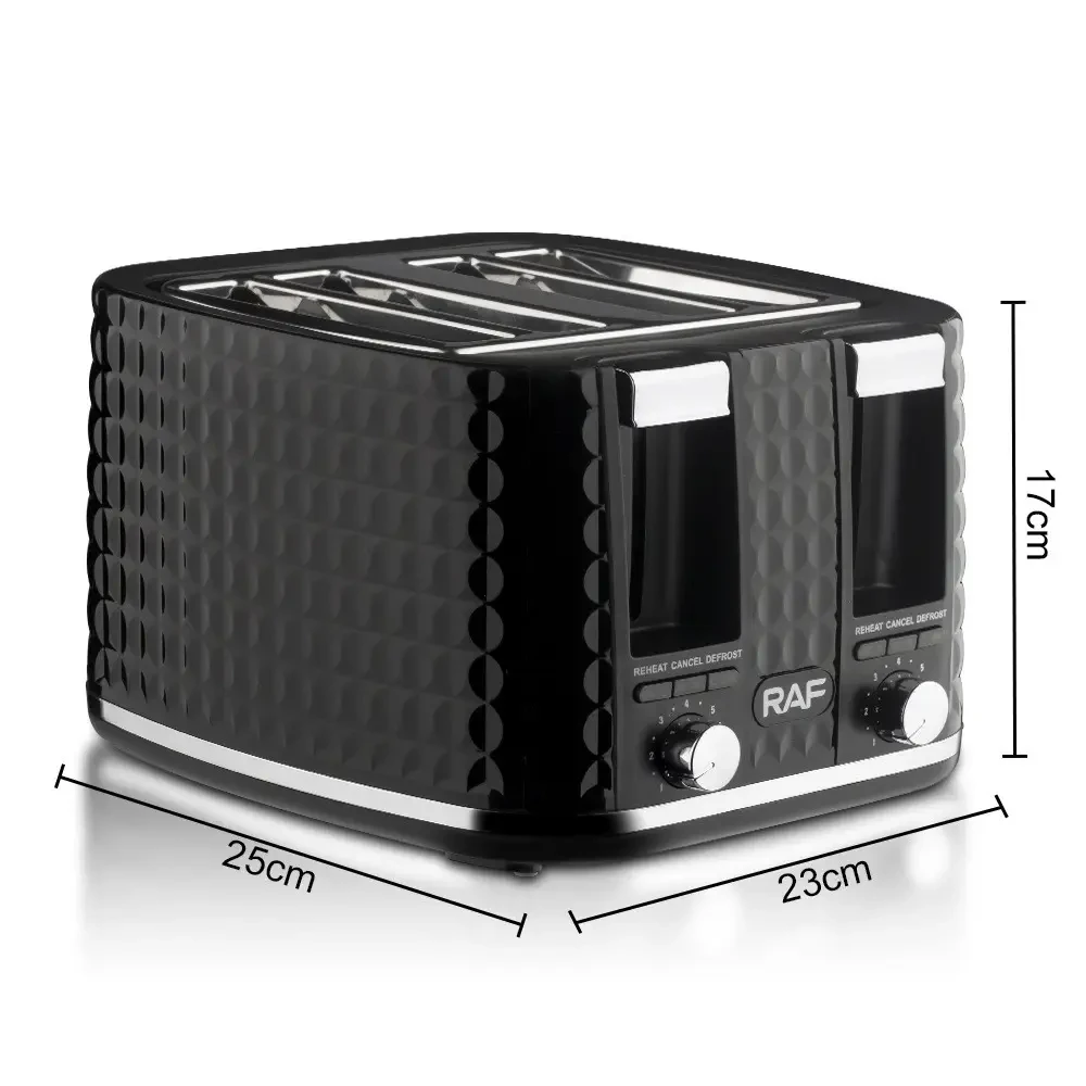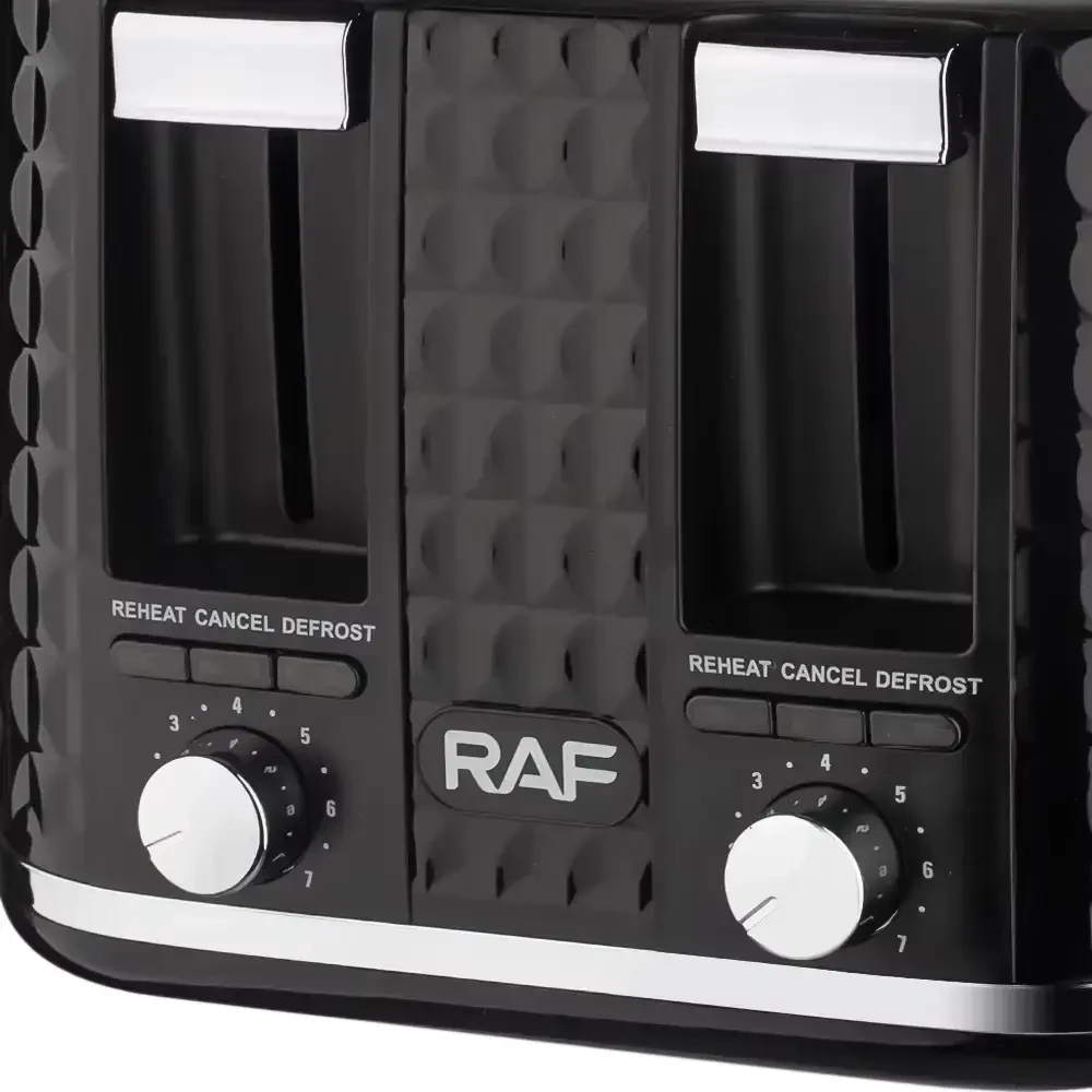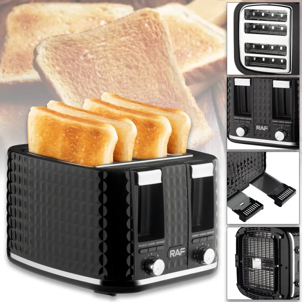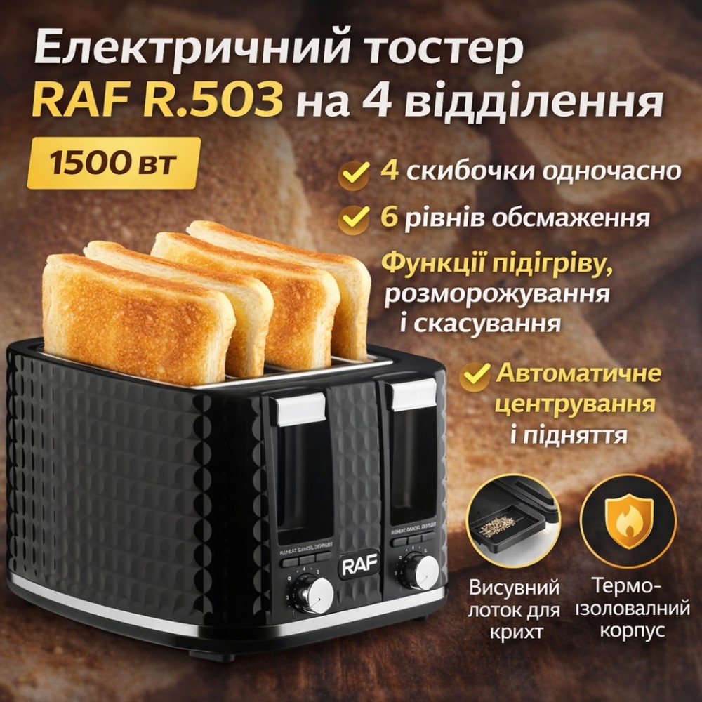 Електричний автоматичний тостер на 4 відділення RAF R.503 1500 Вт Чорний Електричний тостер RAF R.503 — це надійний і стильний прилад, який допоможе швидко та рівномірно підсмажити хліб, приготувати гарячі бутерброди або підігріти випічку. Завдяки чотирьом відділенням можна одночасно приготувати до чотирьох тостів, що особливо зручно для великої родини або компанії. Тостер обладнаний шістьма ступенями обсмажування, даючи змогу вибрати оптимальний рівень хрусткої скоринки. Корпус виготовлений з термостійкого пластику з елементами з неіржавкої сталі, що робить пристрій міцним і довговічним. Вбудовані функції розморожування, підігрівання та скасування приготування забезпечують зручність у використанні. Автоматичне підняття тостів запобігає їхньому пригоранню, а центрування скибочок гарантує рівномірне просмаження з обох боків. Висувний піддон для крихт спрощує чищення приладу, а прогумовані ніжки забезпечують стійкість на будь-якій поверхні. Компактні розміри дають змогу легко розмістити тостер навіть на невеликій кухні, а зручний відсік для зберігання шнура допомагає підтримувати лад. Переваги: 4 відділення — дає змогу готувати більше тостів за один раз. 6 ступенів обсмажування — регульований рівень підсмажування для ідеального результату. Функції підігрівання, розморожування і скасування — розширені можливості для зручності. Автоматичне центрування скибочок — рівномірне просмажування без підгоряння. Висувний піддон для крихт — легкість у догляді та чистоті. Термоізольований корпус — захист від опіків у разі дотику. Прогумовані ніжки — надійна стійкість на поверхні. Компактні розміри — зручне зберігання й розміщення. Характеристики: Тип: електричний тостер Потужність: 1500 Вт Кількість відділень: 4 Кількість тостів: 4 Число ступенів обсмажування: 6 Матеріал корпусу: термостійкий пластик + неіржавка сталь Тип керування: механічне Режими роботи: Підігрів Розморожування Двостороннє підсмажування Функції Регулювання ступеня обсмажування Автоматичне підняття тостів Автоматичне центрування скибочок Кнопка скасування приготування Додаткові особливості: Висувний піддон для крихт Термоізольований корпус Прогумовані ніжки Відсік для зберігання шнура Системи захисту захист від перегрівання Номінальна напруга: 220 В Частота: 50-60 Гц Довжина шнура: 1 м Розміри: 17 × 23 × 25 см Цвет: чорний