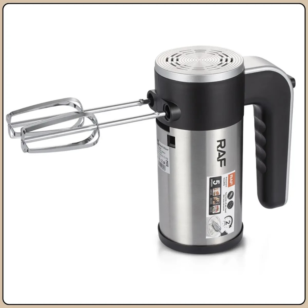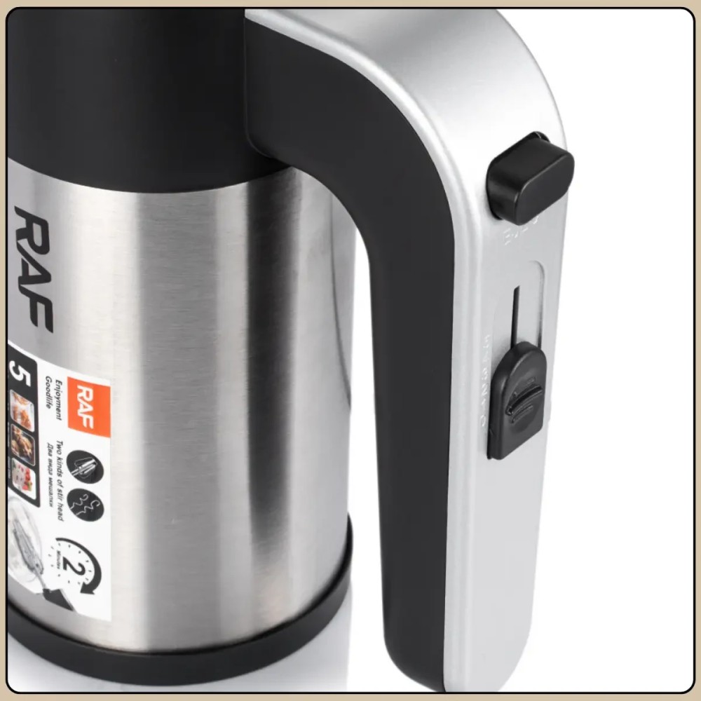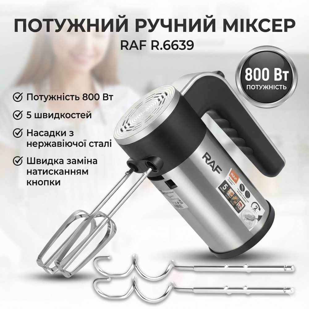 Електричний ручний міксер з регулюванням швидкості та насадками RAF R.6639 800W Ручний міксер RAF R.6639 призначений для швидкого та зручного приготування різних страв в домашніх умовах. Висока потужність 800 Вт і п'ять швидкісних режимів дають змогу ефективно збивати, змішувати та замішувати інгредієнти різної щільності, від легких кремів до щільного тіста. Компактний ручний формат забезпечує зручність зберігання і використання на будь-якій кухні. Корпус виготовлений із поєднання міцного пластику та неіржавкої сталі, що забезпечує надійність і довговічність приладу. Ергономічна форма та збалансована вага роблять роботу комфортною навіть у разі тривалого використання. Кнопка швидкої зміни насадок спрощує догляд за пристроєм і економить час під час готування. Переваги: Висока потужність: забезпечує швидке та рівномірне змішування інгредієнтів П'ять швидкостей: дає змогу точно підібрати режим для різних продуктів Дві пари насадок: підходить для збивання та замішування тіста Насадки з неіржавкої сталі: стійкі до корозії та зносу Висока швидкість двигуна: до 22000 об/хв для ефективної роботи Кнопка швидкого витягання насадок: спрощує заміну й очищення Ергономічний дизайн: зручно лежить у руці під час роботи Характеристики: Тип пристрою: ручний міксер Модель: RAF R.6639 Потужність: 800 Вт Кількість швидкостей: 5 режимів Швидкість двигуна: до 22000 об/хв Матеріал корпусу: пластик і неіржавка сталь Матеріал насадок: неіржавка сталь Колір корпусу: чорний зі сріблястим Розміри: 20х30 см Живлення: 220-240 В Частота: 50-60 Гц Комплектація Ручний міксер Віночки для збивання — 2 шт. Гаки для замішування тіста — 2 шт.