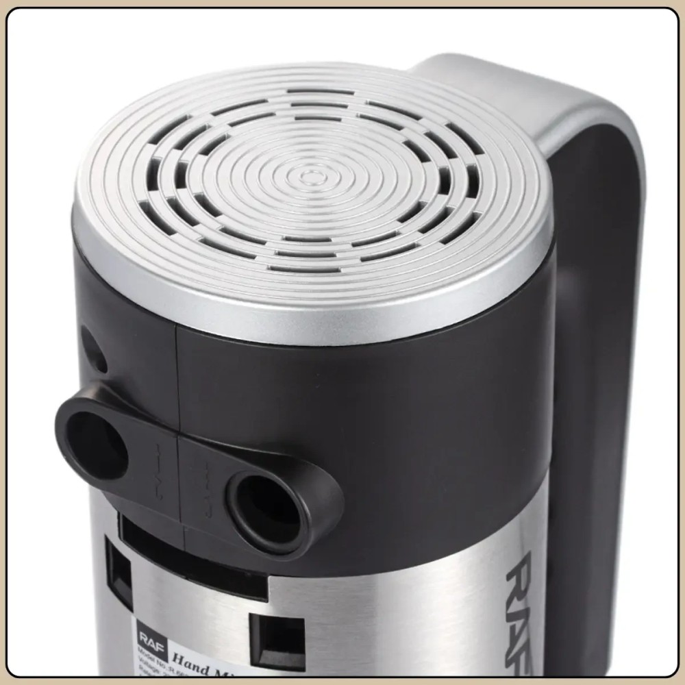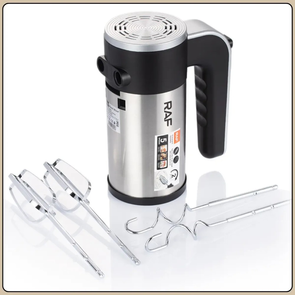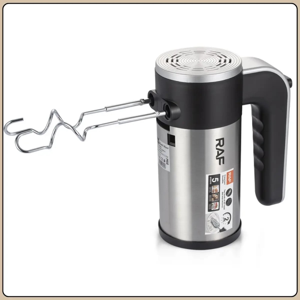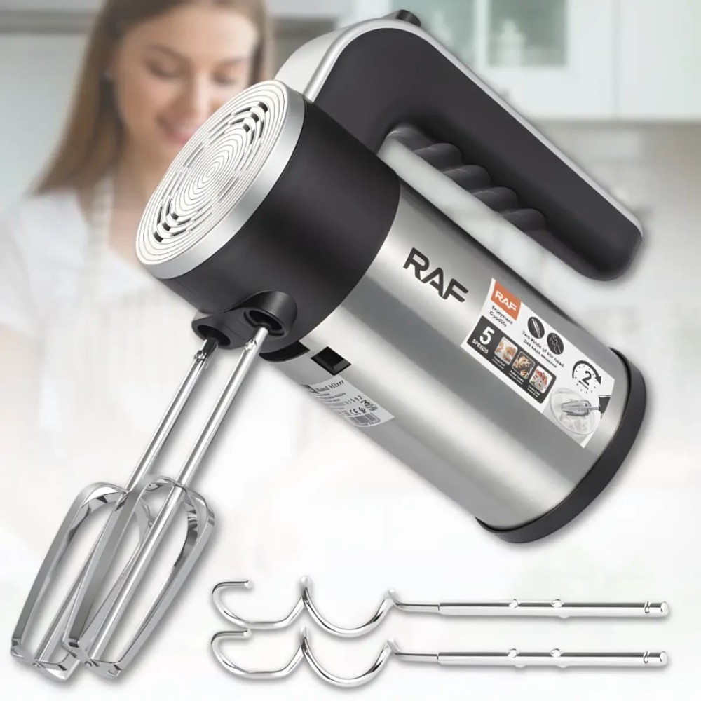Електричний ручний міксер з регулюванням швидкості та насадками RAF R.6639 800W Ручний міксер RAF R.6639 призначений для швидкого та зручного приготування різних страв в домашніх умовах. Висока потужність 800 Вт і п'ять швидкісних режимів дають змогу ефективно збивати, змішувати та замішувати інгредієнти різної щільності, від легких кремів до щільного тіста. Компактний ручний формат забезпечує зручність зберігання і використання на будь-якій кухні. Корпус виготовлений із поєднання міцного пластику та неіржавкої сталі, що забезпечує надійність і довговічність приладу. Ергономічна форма та збалансована вага роблять роботу комфортною навіть у разі тривалого використання. Кнопка швидкої зміни насадок спрощує догляд за пристроєм і економить час під час готування. Переваги: Висока потужність: забезпечує швидке та рівномірне змішування інгредієнтів П'ять швидкостей: дає змогу точно підібрати режим для різних продуктів Дві пари насадок: підходить для збивання та замішування тіста Насадки з неіржавкої сталі: стійкі до корозії та зносу Висока швидкість двигуна: до 22000 об/хв для ефективної роботи Кнопка швидкого витягання насадок: спрощує заміну й очищення Ергономічний дизайн: зручно лежить у руці під час роботи Характеристики: Тип пристрою: ручний міксер Модель: RAF R.6639 Потужність: 800 Вт Кількість швидкостей: 5 режимів Швидкість двигуна: до 22000 об/хв Матеріал корпусу: пластик і неіржавка сталь Матеріал насадок: неіржавка сталь Колір корпусу: чорний зі сріблястим Розміри: 20х30 см Живлення: 220-240 В Частота: 50-60 Гц Комплектація Ручний міксер Віночки для збивання — 2 шт. Гаки для замішування тіста — 2 шт.