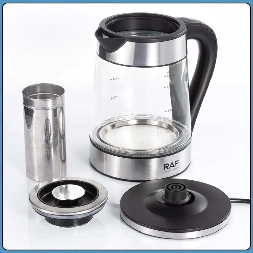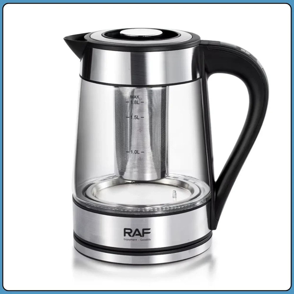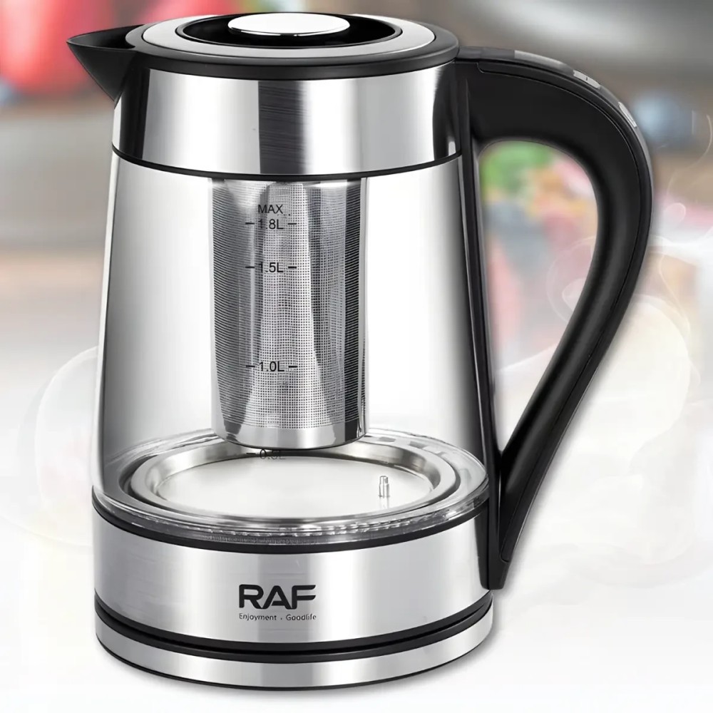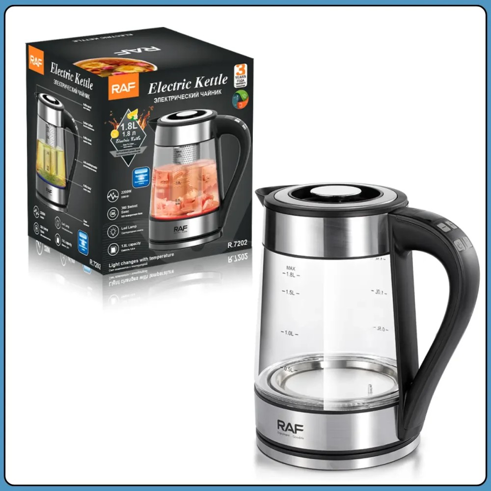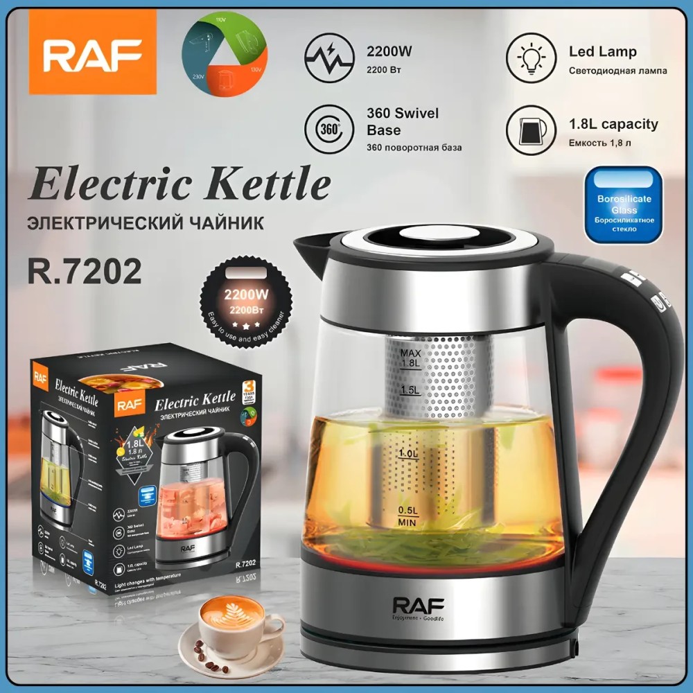 Електричний чайник 1.8 л із заварником й автовимкненням RAF R.7202 2200W Електричний чайник RAF R.7202 поєднує функції класичного чайника та заварника, що робить його зручним рішенням для повсякденного використання. Корпус виготовлений із міцного боросилікатного скла та неіржавкої сталі, завдяки чому прилад стійкий до високих температур і зберігає акуратний зовнішній вигляд. Вбудований фільтр дає змогу заварювати листовий чай прямо в чайнику без використання додаткового посуду. Висока потужність 2200 Вт забезпечує швидке кип'ятіння води, а світлодіодна підсвітка робить процес нагрівання наочним і сучасним. Чайник обладнаний автоматичним вимкненням у разі закипання, а також захистом від перегрівання та википання води, що підвищує безпеку експлуатації та продовжує термін експлуатації пристрою. Переваги: Два в одному: функція чайника та заварника Вбудований фільтр: зручно для заварювання листового чаю Висока потужність: швидке кип'ятіння води Боросилікатне скло: стійке до перепадів температур Світлодіодне підсвічування: візуальний контроль кип'ятіння Автовимкнення: вимикається у разі закипання Захист від перегрівання: безпечна експлуатація Захист від википання: запобігає поломці приладу Характеристики: Тип пристрою: електричний чайник із заварником Бренд: RAF Модель: R.7202 Потужність: 2200 Вт Місткість: 1,8 л Матеріал корпусу: боросилікатне скло, неіржавка сталь Фільтр: вбудований заварник Підсвічування: світлодіодна Автовимкнення: під час закипання води Захист від перегрівання: є Захист від википання: є Колір корпусу: чорний Напруга: 220-240 В Частота: 50-60 Гц Розмір: 22×13 см