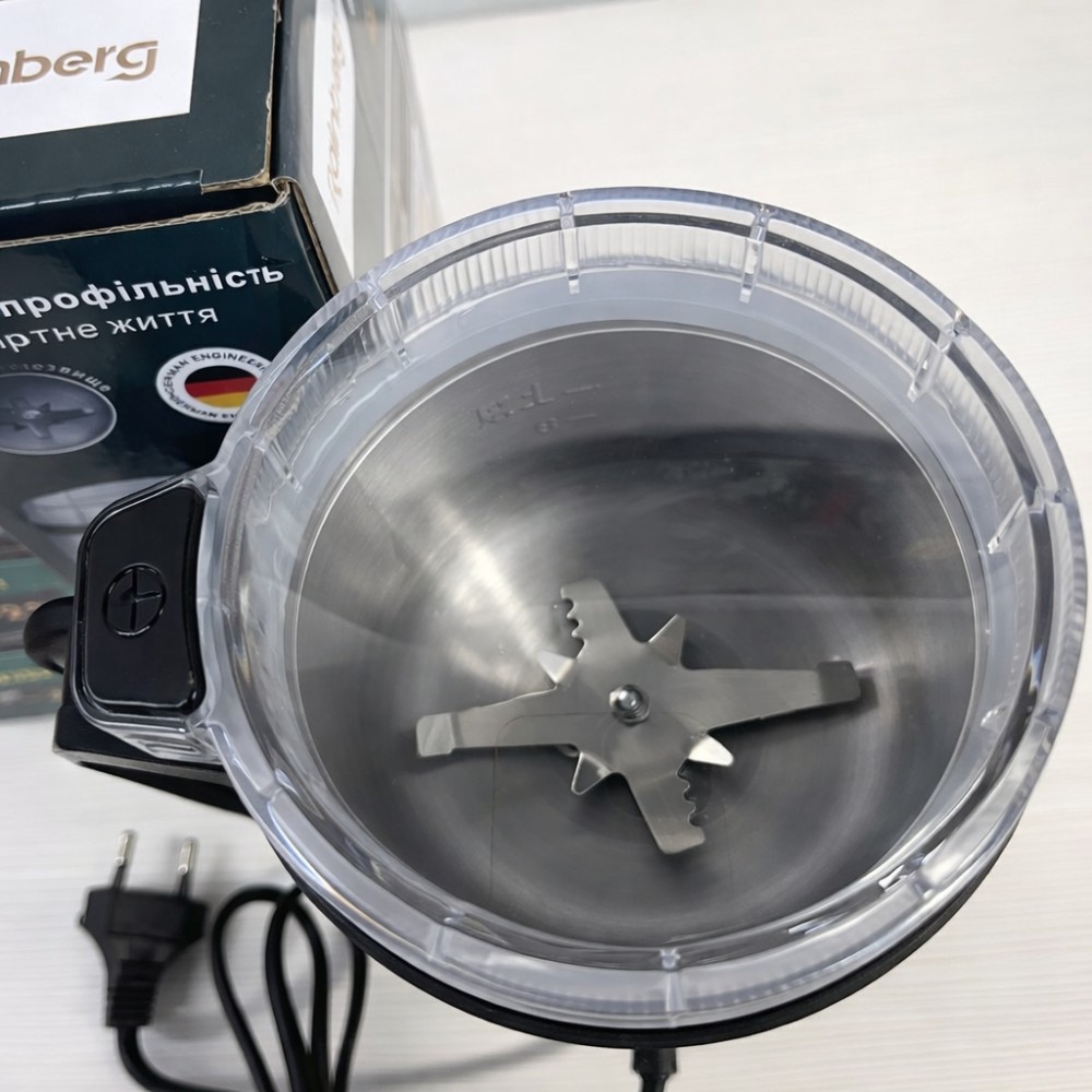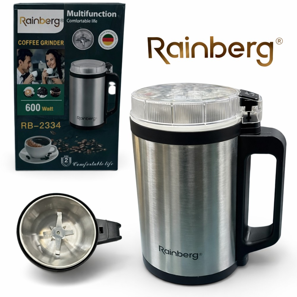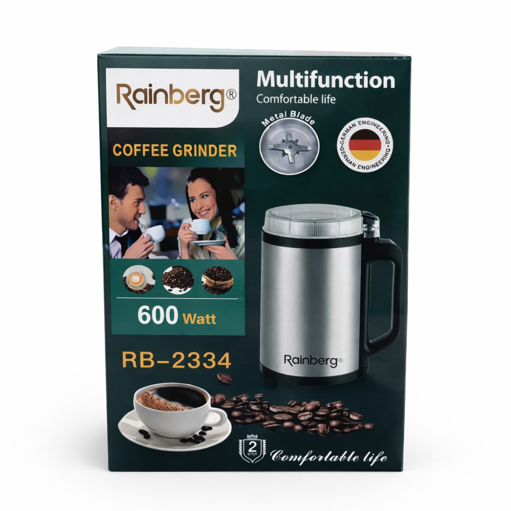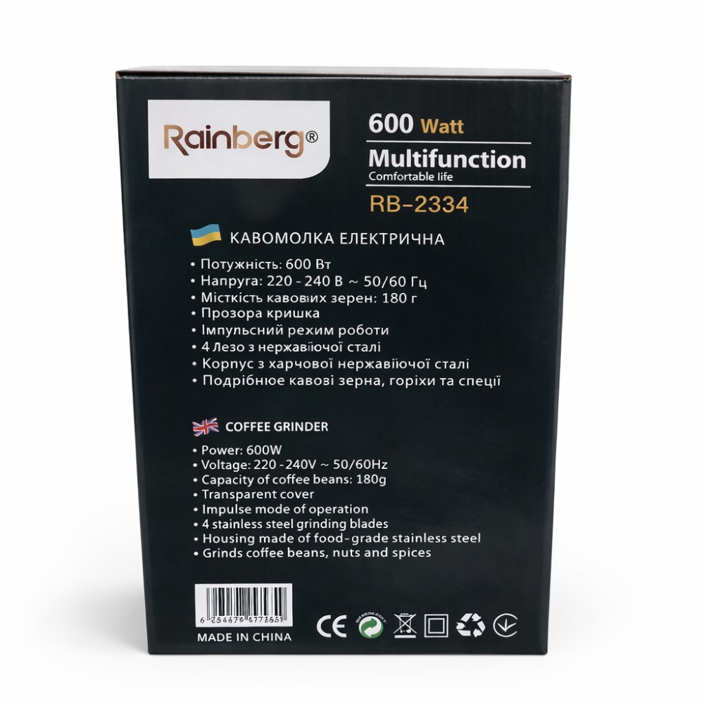 Опис Електрична кавомолка Rainberg RB-2334 — це потужний і компактний кухонний прилад для швидкого та рівномірного подрібнення кавових зерен, горіхів, насіння, спецій і круп. Потужність 600 Вт забезпечує ефективну роботу навіть із твердими інгредієнтами, а чотири гострі леза з нержавіючої сталі гарантують однорідний помел за лічені секунди. Міцний корпус із нержавіючої сталі стійкий до зношування та легко очищується. Прозора кришка дозволяє контролювати процес подрібнення, а імпульсний режим роботи забезпечує точний результат без перегріву продуктів. Кавомолка має компактні розміри, зручну ручку та проста у використанні — ідеальне рішення для щоденного застосування на кухні. Переваги Висока потужність 600 Вт 4 леза з нержавіючої сталі для рівномірного помелу Підходить для кави, горіхів, спецій і круп Імпульсний режим роботи Прозора кришка для контролю процесу Міцний корпус з нержавіючої сталі Компактний розмір і зручне зберігання Просте керування одним натисканням Характеристики Модель: Rainberg RB-2334 Тип: кавомолка електрична Потужність: 600 Вт Напруга: 220–240 В, 50/60 Гц Кількість лез: 4 Матеріал лез: нержавіюча сталь Матеріал корпусу: нержавіюча сталь Тип керування: механічний Режим роботи: імпульсний Призначення: кава, горіхи, насіння, спеції, крупи Комплектація Кавомолка Rainberg RB-2334 Інструкція з експлуатації Заводська упаковка