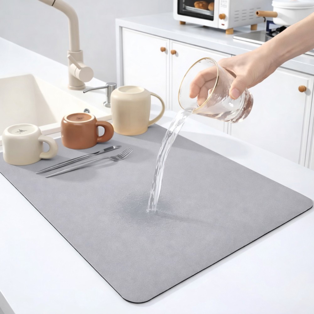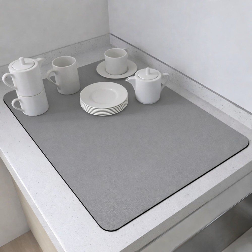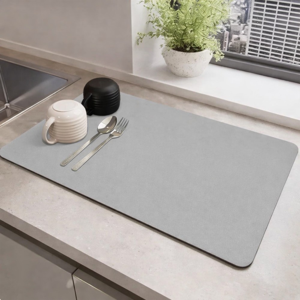 Килимок для сушіння посуду призначений для використання на кухонній стільниці та забезпечує зручне й акуратне сушіння посуду після миття. Завдяки вологопоглинальній та абсорбувальній поверхні килимок ефективно вбирає воду та допомагає підтримувати робочу зону сухою й чистою. Основні характеристики: Розмір: 30 × 30 см Форма: прямокутна Цвет: сірий Матеріал: поліпропілен Тип розміщення: настільний Функціональні особливості: Вологопоглинальна поверхня швидко поглинає воду під час сушіння посуду Антиковзна основа запобігає зміщенню килимка по стільниці Абсорбувальний матеріал допомагає утримувати вологу та захищає поверхню від намокання Килимок захищає стільницю від подряпин, відколів і вм'ятин Підходить для розміщення чашок, склянок, столового приладдя та іншого кухонного начиння Може використовуватися не тільки для сушіння посуду, але і як підставка для кухонного приладдя Догляд та використання: Килимок легко очищається від забруднень Стійкий до впливу води та олійних плям Швидко висихає після використання Підходить для щоденного застосування на кухні Килимок для сушіння посуду — практичне рішення для організації простору біля мийки та захисту кухонної поверхні від вологи.