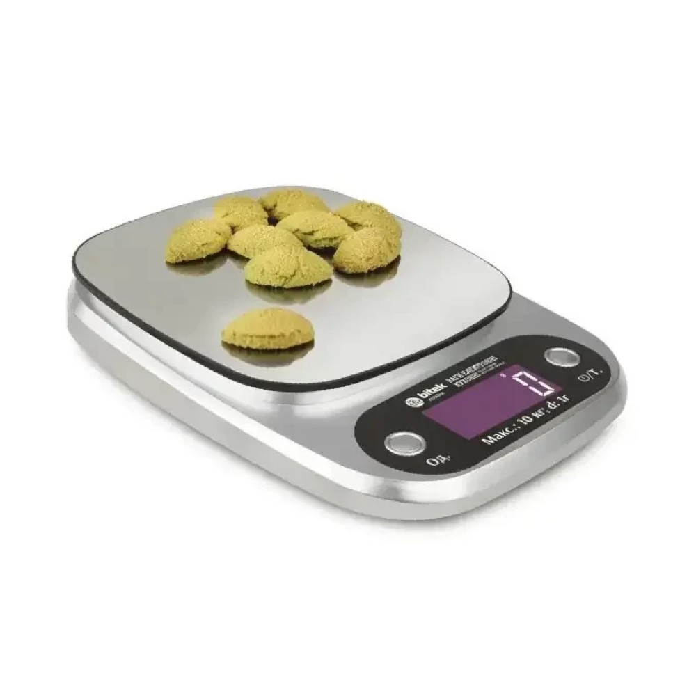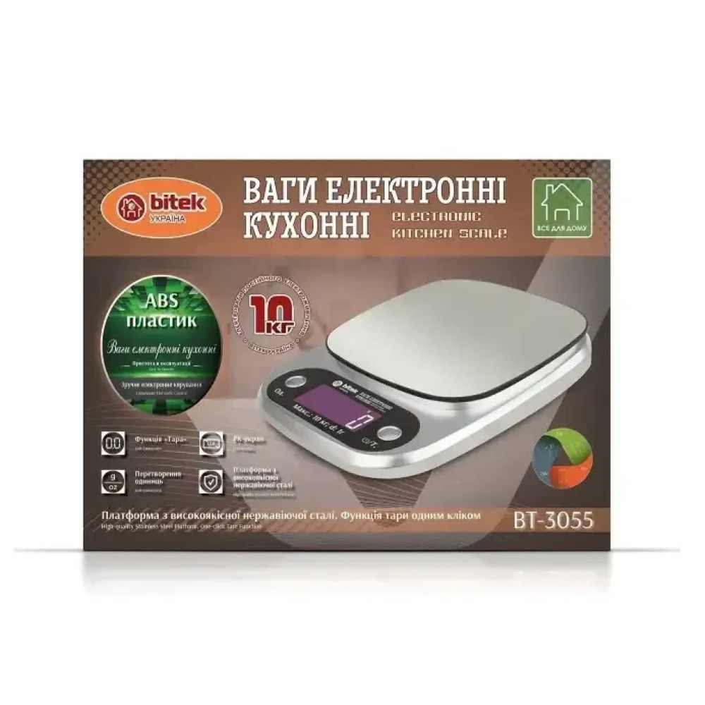 Кухонні ваги для продуктів електронні BITEK BT-3055 до 10 кг з LCD-дисплеєм точні побутові ваги для кухні Електронні кухонні ваги BITEK BT-3055 — це зручний і практичний прилад для точного зважування продуктів на кухні. Максимальне навантаження до 10 кг дає змогу використовувати ваги як для невеликих інгредієнтів, так і для більших порцій продуктів. Ваги обладнані цифровим LCD-дисплеєм, який забезпечує чітке зображення результатів вимірювання. Компактний дизайн робить пристрій зручним для зберігання та щоденного використання. Завдяки високій точності вимірювання ваги чудово підходять для приготування різних страв, випічки та дієтичного харчування. Характеристики: Тип: кухонні електронні ваги Модель: BITEK BT-3055 Максимальне навантаження: 10 кг Тип дисплея: LCD Висока точність зважування Компактний і зручний дизайн Просте керування Підходять для дому та кухні