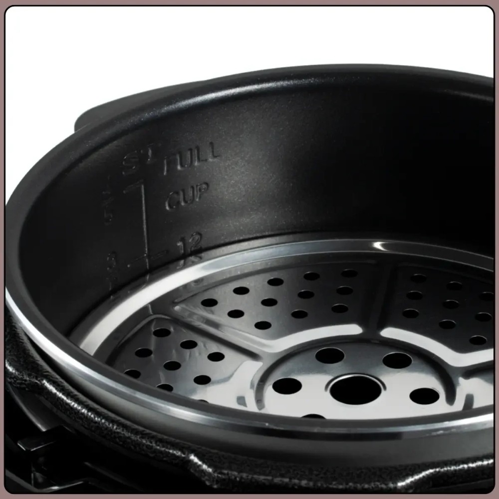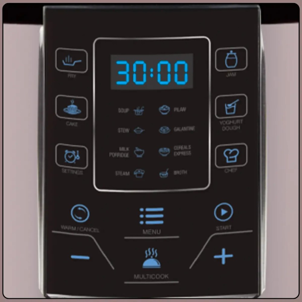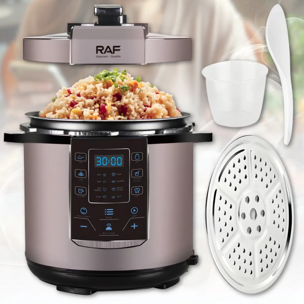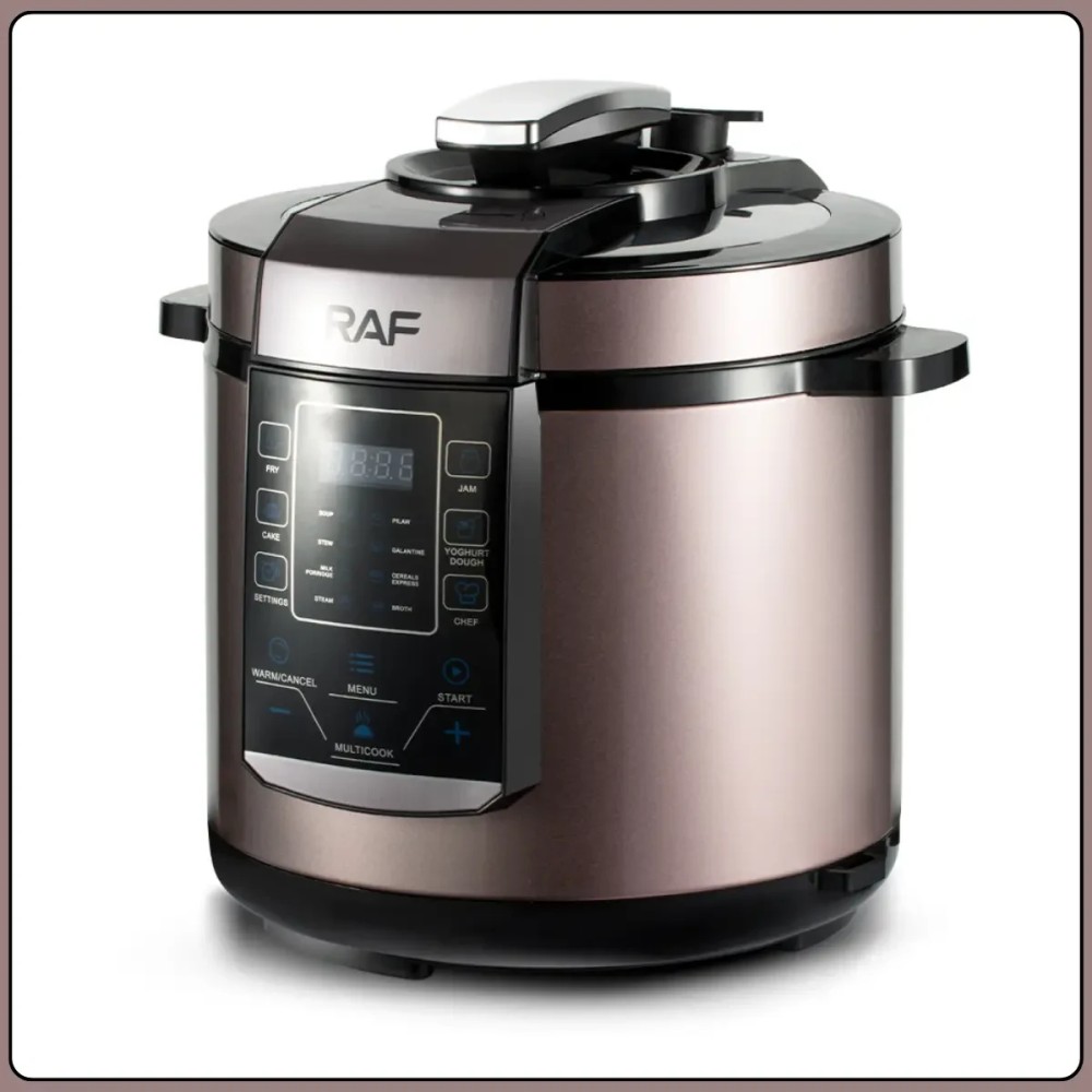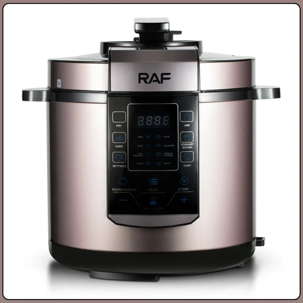 Мультиварка із сенсорним керуванням і антипригарною чашею на 6 літрів RAF R.171 1000W Мультиварка RAF R.171 — це сучасний кухонний прилад, , який поєднує функції декількох пристроїв одночасно. З потужністю 1000 Вт і чашею об'ємом 6 літрів вона підходить для приготування страв для всієї родини. Цифровий дисплей із сенсорним керуванням дає змогу легко вибирати один із 14 автоматичних режимів, як-от тушкування, варіння, смаження, приготування на парі та випікання. Антипригарне покриття внутрішньої чаші спрощує очищення після готування. Прилад обладнаний функцією захисту від перегрівання, що гарантує безпечне використання. За допомогою вбудованої парової чаші можна готувати корисні страви на парі, зберігаючи вітаміни та смак продуктів. Компактний дизайн і привабливий рожевий колір корпусу роблять мультиварку зручною та стильною для будь-якої кухні. Переваги: Потужна чаша: дає змогу готувати швидко та рівномірно Багато програм: 14 автоматичних режимів приготування Антипригарне покриття: легке очищення та брак прилипання їжі Цифровий дисплей: зручне сенсорне керування Захист від перегрівання: безпека під час використання Блокування кришки: запобігає випадковому відкриванню Характеристики: Тип: мультиварка Потужність: 1000 Вт Об'єм чаші: 6 л Кількість програм: 14 автоматичних Керування: сенсорний, цифровий дисплей Матеріал чаші: антипригарне покриття Захист: від перегрівання, блокування кришки Колір корпусу: рожевий Розмір: 36×24 см Напруга: 220 В, 50 Гц Функції тушкування, варіння, смаження, випічка, приготування на парі Комплектація Мультиварка RAF R.171 Блюдо для приготування на парі Лопатка/ложка Мірний стакан Паковання