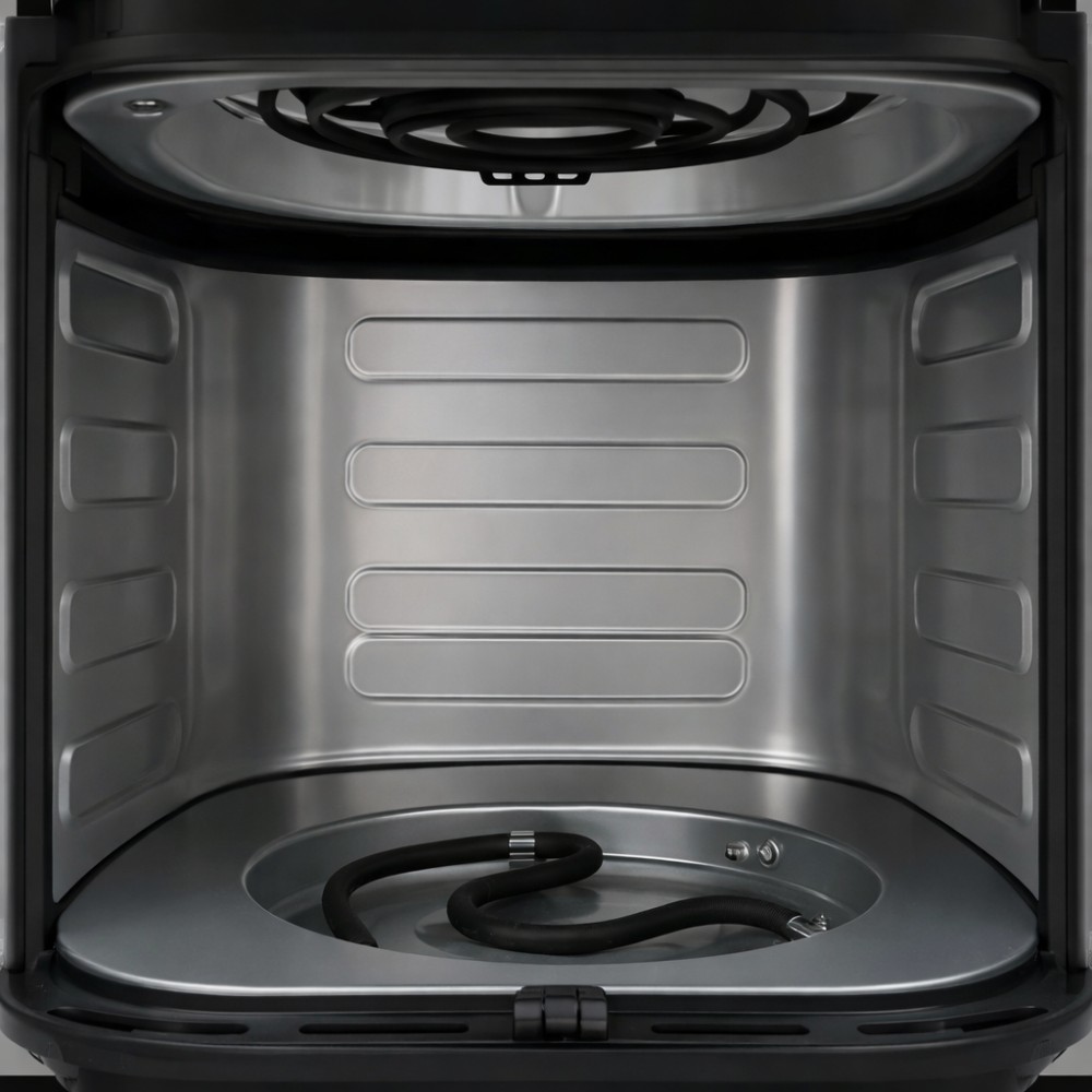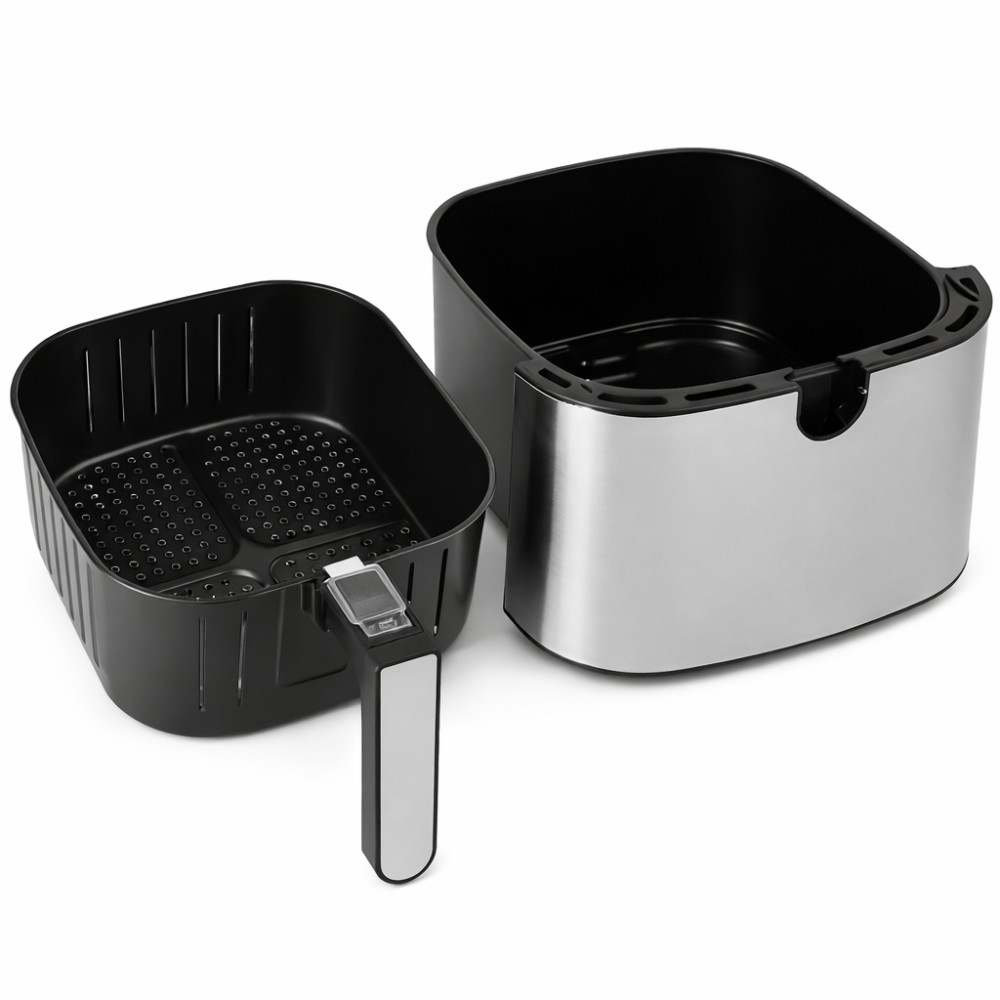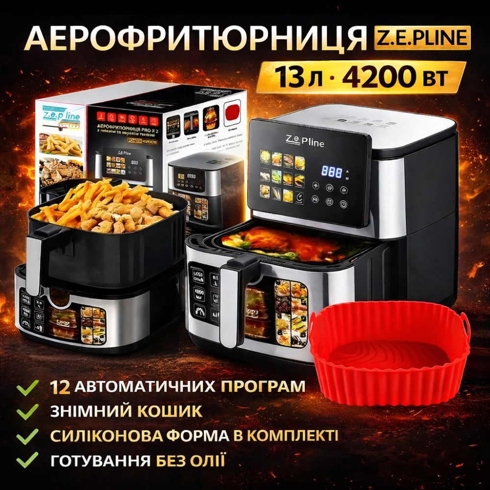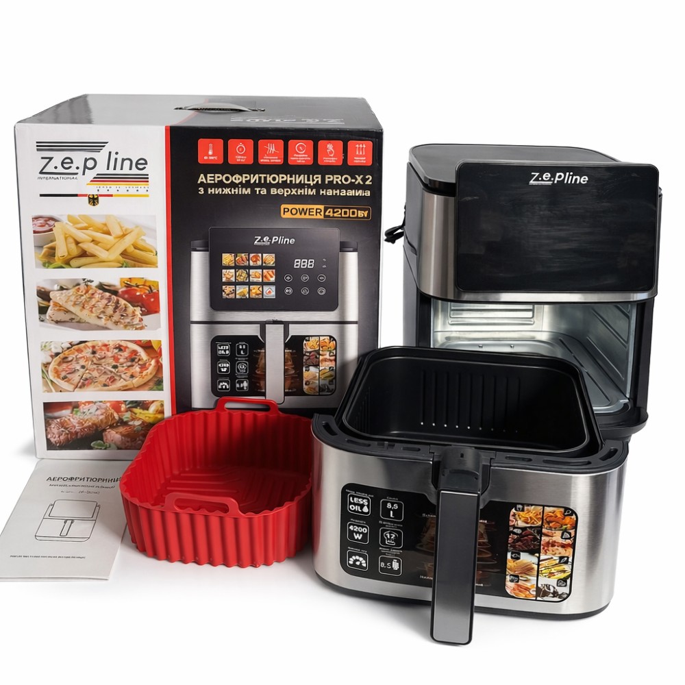 Аерофритюрниця Zepline ZP-00342 — це багатофункційний пристрій для приготування страв із використанням циркуляції гарячого повітря. Загальний обсяг робочої камери становить 13 літрів, що дає змогу готувати порції для сім'ї або кількох людей одночасно. Потужність пристрою — 4200 Вт, що забезпечує швидке нагрівання та рівномірне приготування продуктів. Аерофритюрниця обладнана 12 автоматичними програмами, призначеними для приготування різних страв, включно з картоплями фрі, м'ясом, куркою, рибою, овочами та випічку. Керування здійснюється за допомогою сенсорної панелі з дисплеєм, розміщеної на передній частині корпусу. Також передбачена можливість ручного налаштування параметрів приготування. Корпус виготовлений з неіржавкої сталі та пластику. Конструкція містить знімний кошик з антипригарним покриттям, що полегшує завантаження продуктів і очищення після використання. До комплекту входить силіконова форма, призначена для запікання та приготування страв усередині аерафритюрниці. Приготування відбувається з мінімальною кількістю олії або без її використання, завдяки технології циркуляції гарячого повітря. Формат пристрою настільний, з вертикальною конструкцією й прозорим оглядовим вікном для візуального контролю процесу приготування. Аерофритюрниця призначена для домашнього використання і підходить для запікання, смаження, розігрівання та приготування різноманітних страв. ХАРАКТЕРИСТИКИ Тип: аерофритюрниця Бренд: Zepline Модель: ZP-00342 Потужність: 4200 Вт Загальний об'єм: 13 л Кількість програм: 12 Керування: сенсорне Технологія приготування: циркуляція гарячого повітря Матеріал корпусу: неіржавка сталь, пластик Покриття кошика: антипригарне Конструкція: знімний кошик Колір: чорний/сріблястий КОМПЛЕКТАЦІЯ Аерофритюрниця Zepline ZP-00342 Знімний кошик Силіконова форма Аксесуари для приготування (решітки — без вказівки кількості) Заводське паковання