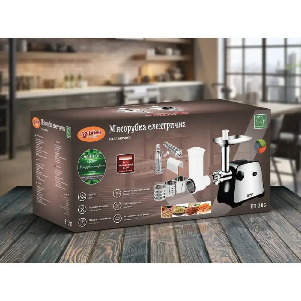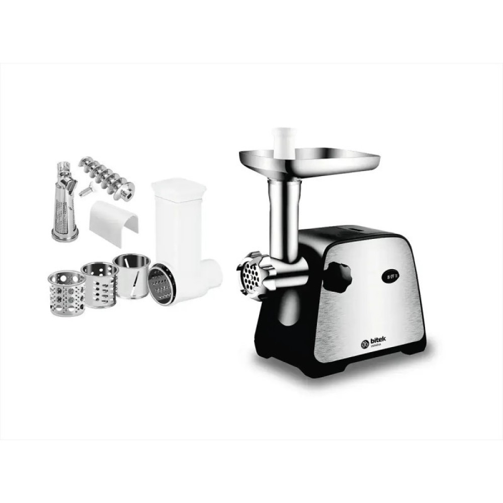 М'ясорубка електрична BITEK BT-3700 — потужний кухонний помічник 4200 Вт із насадками для фаршу, ковбас, кебе й овочів. М'ясорубка BITEK BT-3700 поєднує в собі високу продуктивність і функціональність. Завдяки потужності 4200 Вт, пристрій легко справляється з м'ясом, рибою, овочами та навіть фруктами. До комплекту входять насадки для фаршу, кебе, ковбас, овочерізки та соковичавниця, що робить цю модель універсальним рішенням для будь-якої кухні. Функція реверсу запобігає забиванню шнека та полегшує очищення. Корпус і шнек виготовлені з металу, а прогумовані ніжки забезпечують стійкість під час роботи. Переваги: Потужність 4200 Вт Функція реверсу Насадки для фаршу, ковбас, кебе, соку, овочів Соковичавниця в комплекті Металеві деталі — корпус і шнек Стійкі прогумовані ніжки Характеристики: Потужність: 4200 Вт Продуктивність: 2 кг/хв Матеріали: неіржавка сталь, метал, пластик Живлення: 220-240 В, 50/60 Гц Кількість насадок: 3 для фаршу, 1 для ковбас, 1 для кебе, 1 для соку, 3 для овочів Тип ножів: нержавіюча сталь Функція реверсу: є Комплектація М'ясорубка BITEK BT-3700 3 решітки для фаршу Насадка для кебе Насадка для ковбас Насадка для соку 3 овочеві насадки Ніж із неіржавкої сталі Металевий лоток Пластиковий штовхач Інструкція Заводське паковання