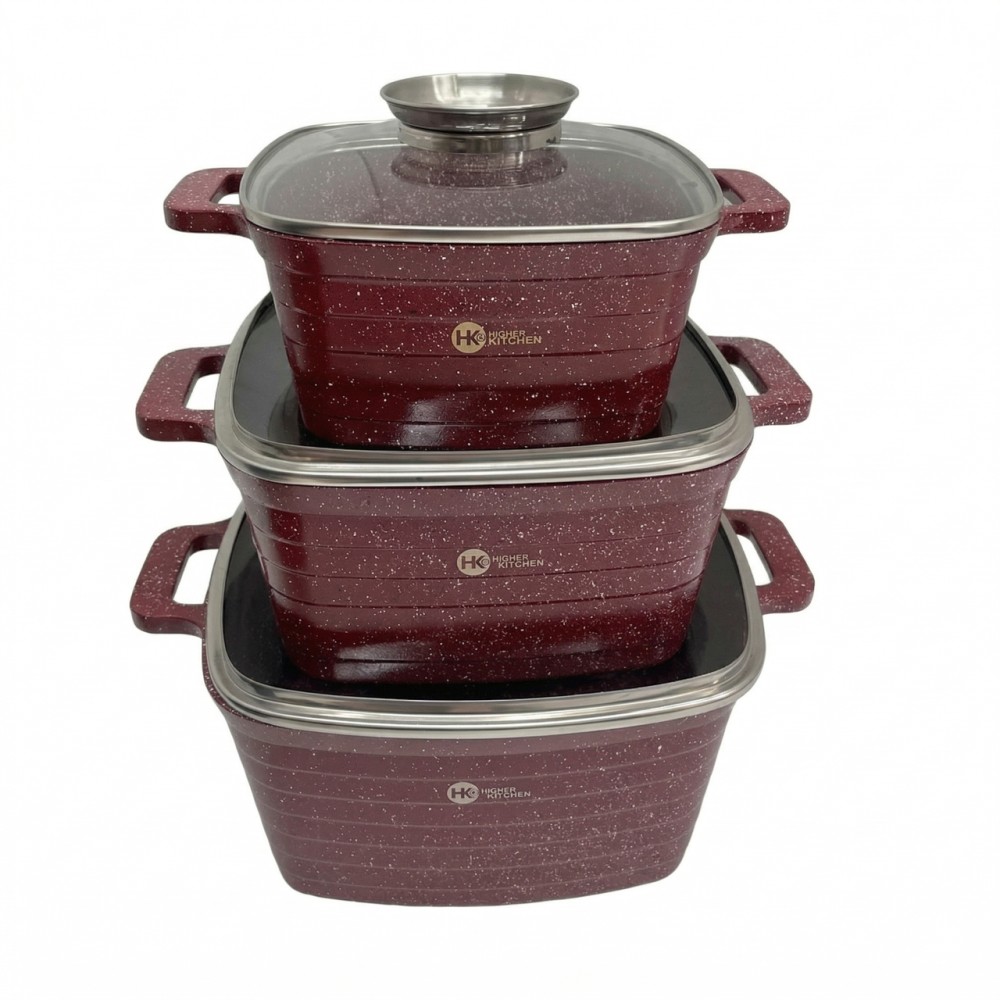Набір квадратних казанів Higher Kitchen HK-322 — це чудове поєднання сучасного стилю, функціональності та надійності для вашої кухні. Виготовлені з міцного литого алюмінію з антипригарним гранітним покриттям з обох боків, казани гарантують рівномірний розподіл тепла та довгий термін експлуатації. Індукційне багатошарове дно підходить для всіх типів плит, включно з індукційними. Кожна кришка виготовлена з жароміцного скла та має паровідвід, даючи змогу контролювати процес приготування, не підіймаючи кришку. Зручні литі термостійкі ручки гарантують безпечне використання навіть за високих температур. Посуд легко очищається, стійкий до пошкоджень і зберігає зовнішній вигляд навіть за активної експлуатації. Завдяки квадратній формі, ви отримуєте більше місця для приготування та зручності зберігання. Підходить для варіння, тушкування, смаження та запікання. Доступний у класичних кольорах — червоному та чорному — він легко впишеться в будь-яку кухонну атмосферу. Виробництво — Німеччина, з дотриманням європейських стандартів якості. Характеристики Параметри Значення Виробник Higher&Kitchen Країна-виробник Германия Кількість предметів 6 Матеріал Граніт + литий алюміній Внутрішнє покриття Гранітне Антипригарне покриття Так (вісь набір) Тип дна Потовщене індукційне Кришки Жароміцне скло з отвором для пари Ручки Литі, термостійкі Тип плити Газова, електрична, індукційна, склокерамічна Колір Червоний, чорний Стан Новий Комплектація 3 казана з кришками (20х20х9.5 см — 3 л, 24х24х11 см — 5 л, 28х28х12.5 см — 7 л) Переваги товару Міцне гранітне покриття з обох боків Литий алюміній — легкий, але надійний матеріал Підходить для всіх типів плит, включно з індукцією Потовщене дно забезпечує рівномірне нагрівання Жароміцні кришки з отвором для пари Зручні та безпечні литі ручки Сучасний дизайн у червоному та чорному кольорах Стійкість до пошкоджень і легкий догляд Виробництво — Німеччина, європейська якість