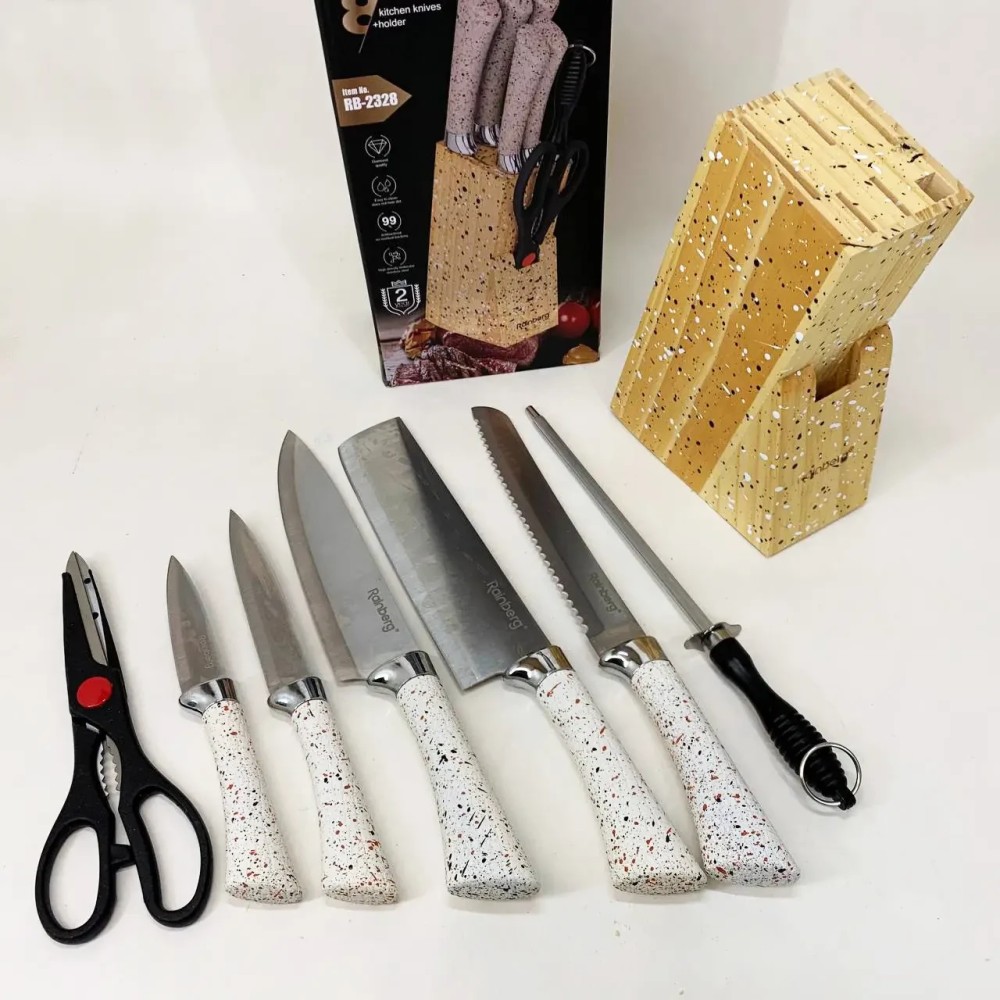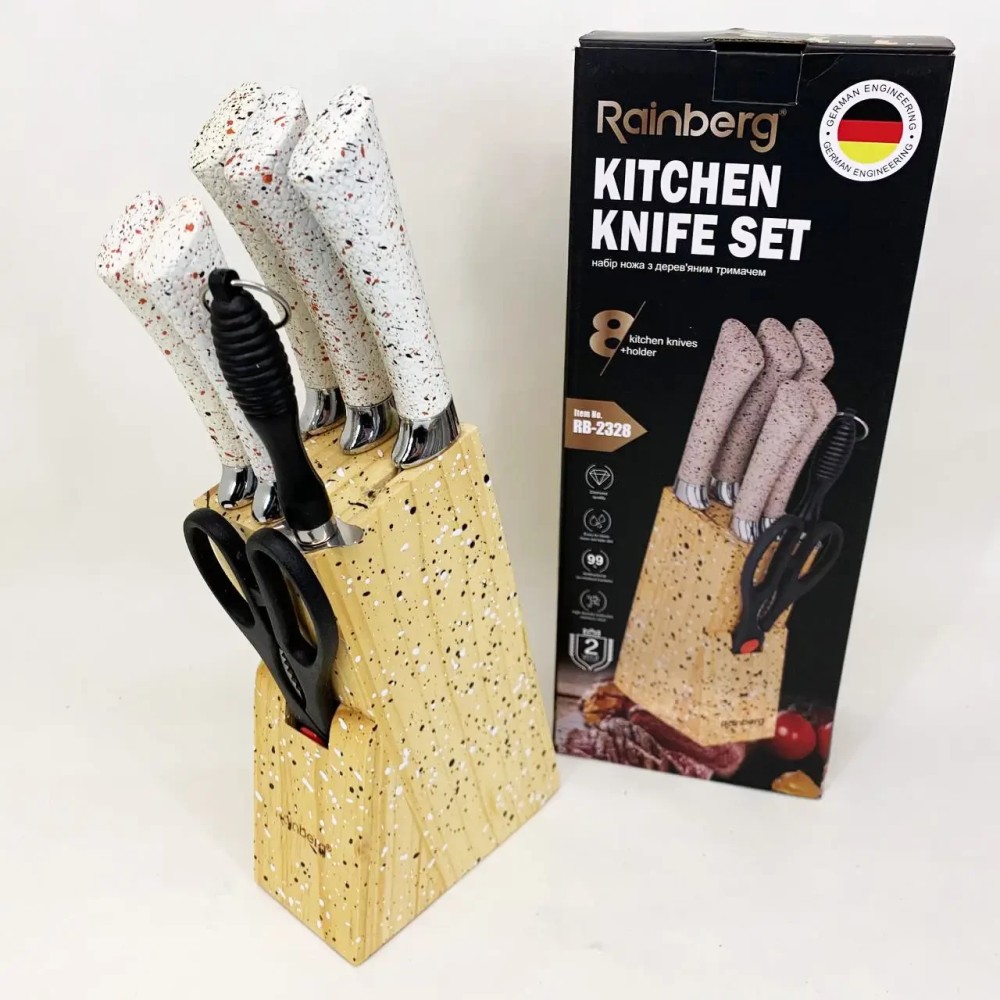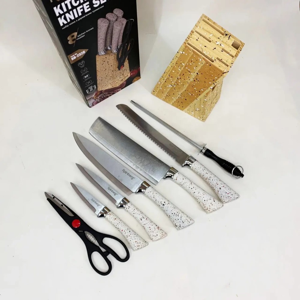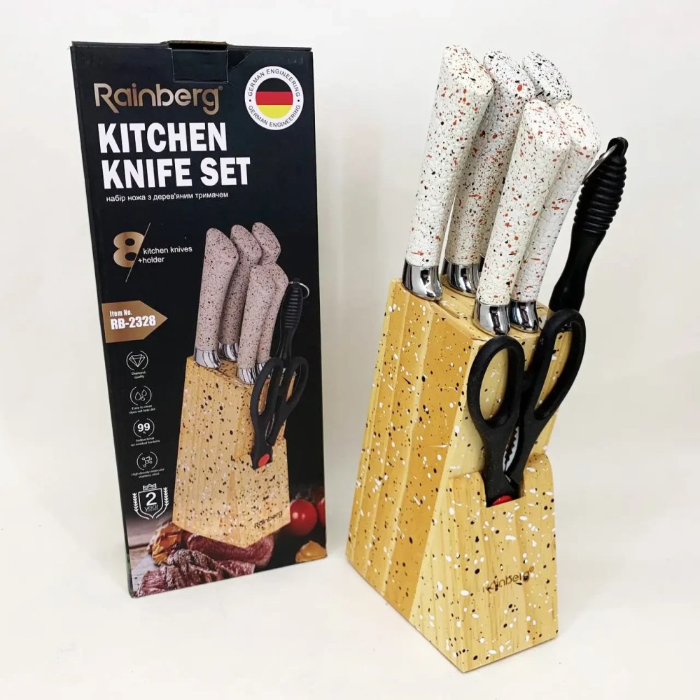 Кухонний набір ножів Rainberg RB-2328 — це функціональний комплект для щоденного використання на домашній кухні, який містить усі основні інструменти для підготовки продуктів і зручного зберігання. До набору входять 5 кухонних ножів різного призначення, кухонні ножиці, мусак для виправлення лез и дерев'яна підставка. Усі елементи розміщуються в одному блоці, що дає змогу підтримувати лад на робочій поверхні та економити простір. Ножі Леза всіх ножів виготовлені з неіржавкої сталі, стійкої до зносу та корозії. Ножі підходять для повсякденних кухонних завдань: нарізання овочів, фруктів, м'яса, риби та інших продуктів. Форма лез забезпечує зручність під час роботи й акуратне різання. Ручки виготовлені з пластику з гранітною текстурою, мають ергономічну форму та забезпечують впевнене захоплення. Поверхня ручок знижує ковзання в руці та робить роботу комфортнішою навіть у разі тривалого використання. Ножиці Кухонні ножиці призначені для допоміжних завдань: розкриття паковань, підрізання продуктів та інших побутових операцій. Зберігаються в загальній підставці разом із ножами. Мусат Мусат використовується для регулярного виправлення лез і допомагає підтримувати ножі в робочому стані без потреби частого заточування. Це продовжує термін експлуатації ножів і зберігає зручність роботи. Підставка Дерев'яна підставка розрахована на зберігання всіх елементів набору. Вертикальний формат розміщення забезпечує швидкий доступ до інструментів, акуратний зовнішній вигляд і безпечне зберігання ножів. Призначення Набір підходить для: щоденного приготування їжі вдома використання на кухні квартири або будинку комплектації нової кухні практичного подарунка Комплектація 5 кухонних ножів кухонні ножиці мусат дерев'яна підставка Ключові особливості повний кухонний набір в одному комплекті леза з неіржавкої сталі ергономічні ручки з гранітною текстурою мусак для підтримки гостроти ножів дерев'яна підставка для зручного зберігання