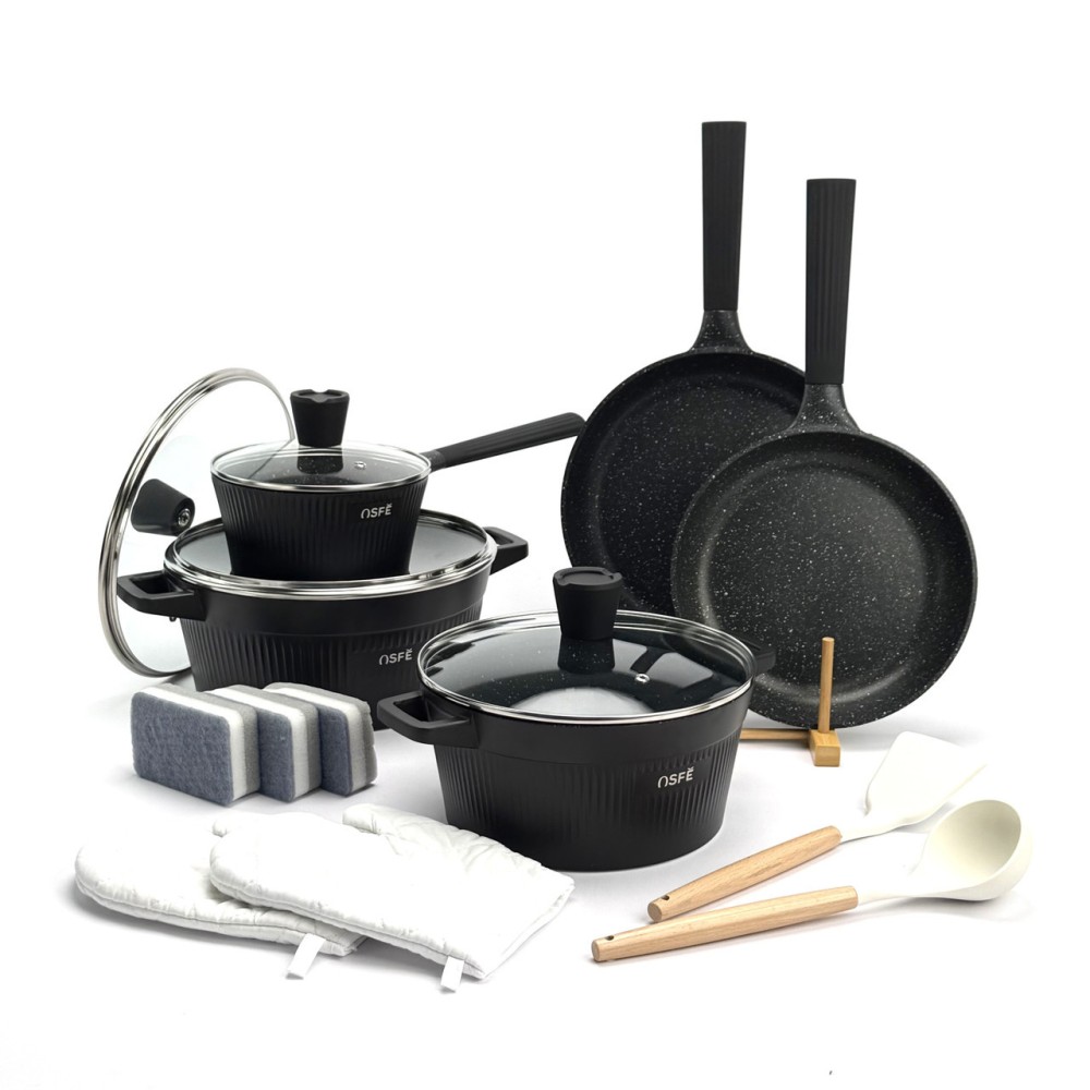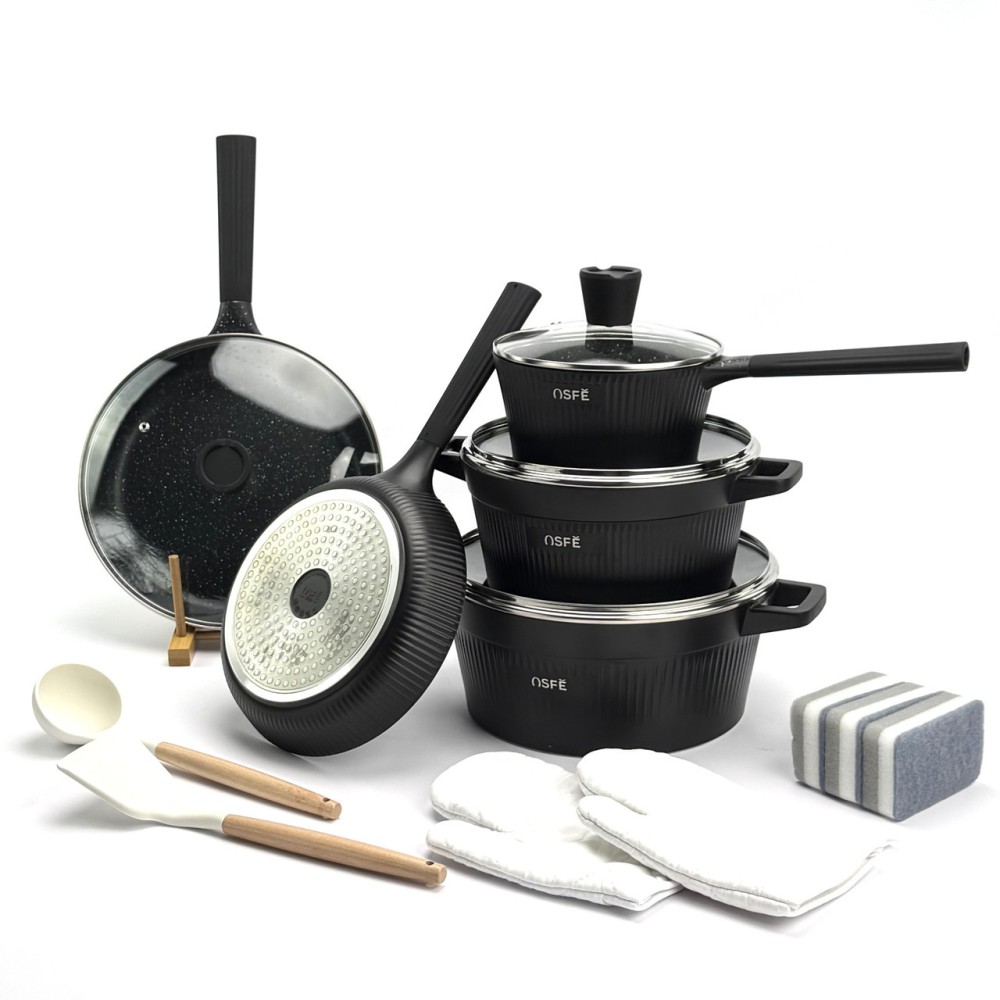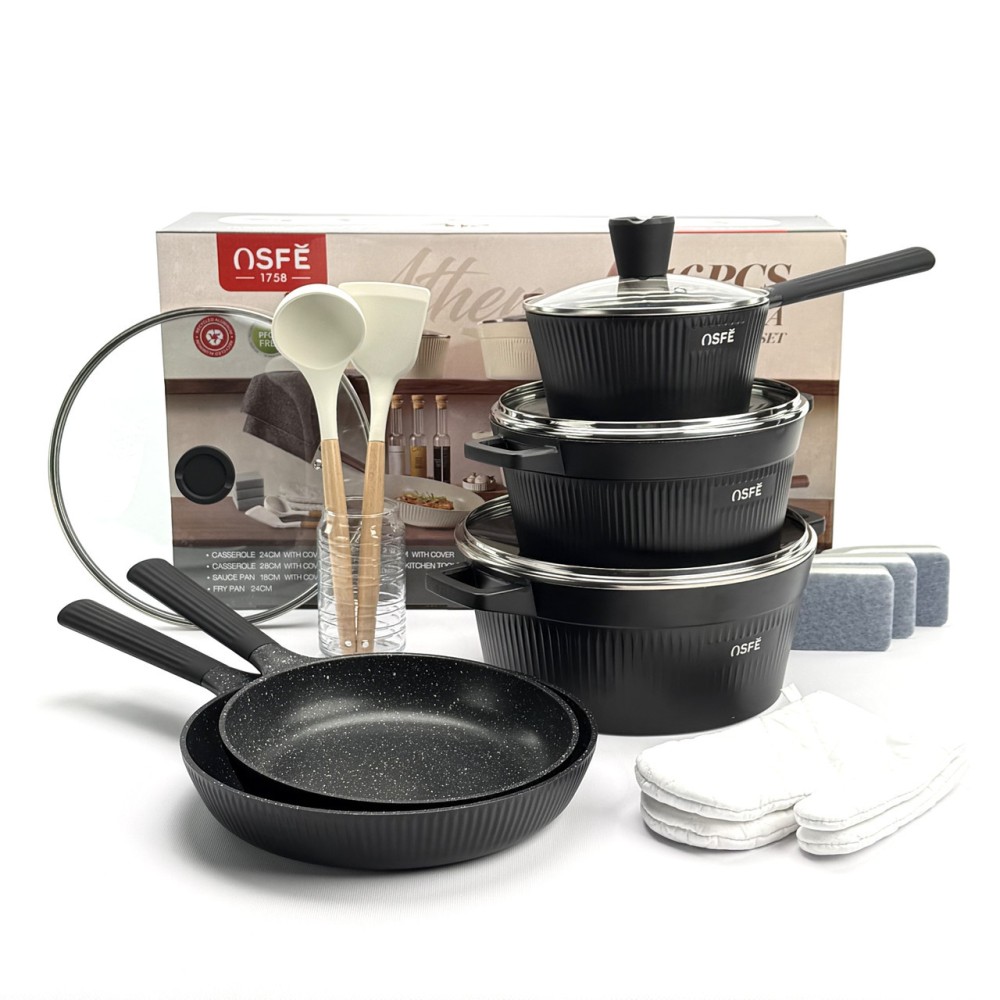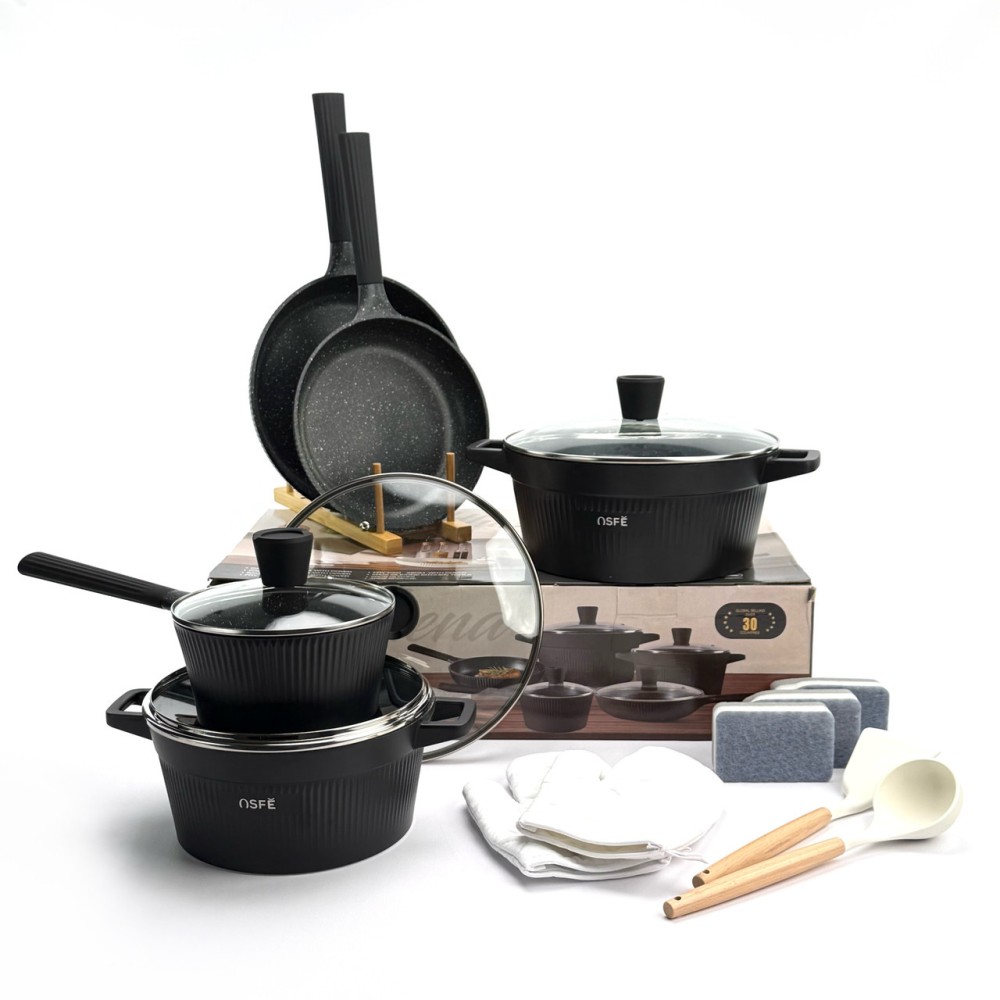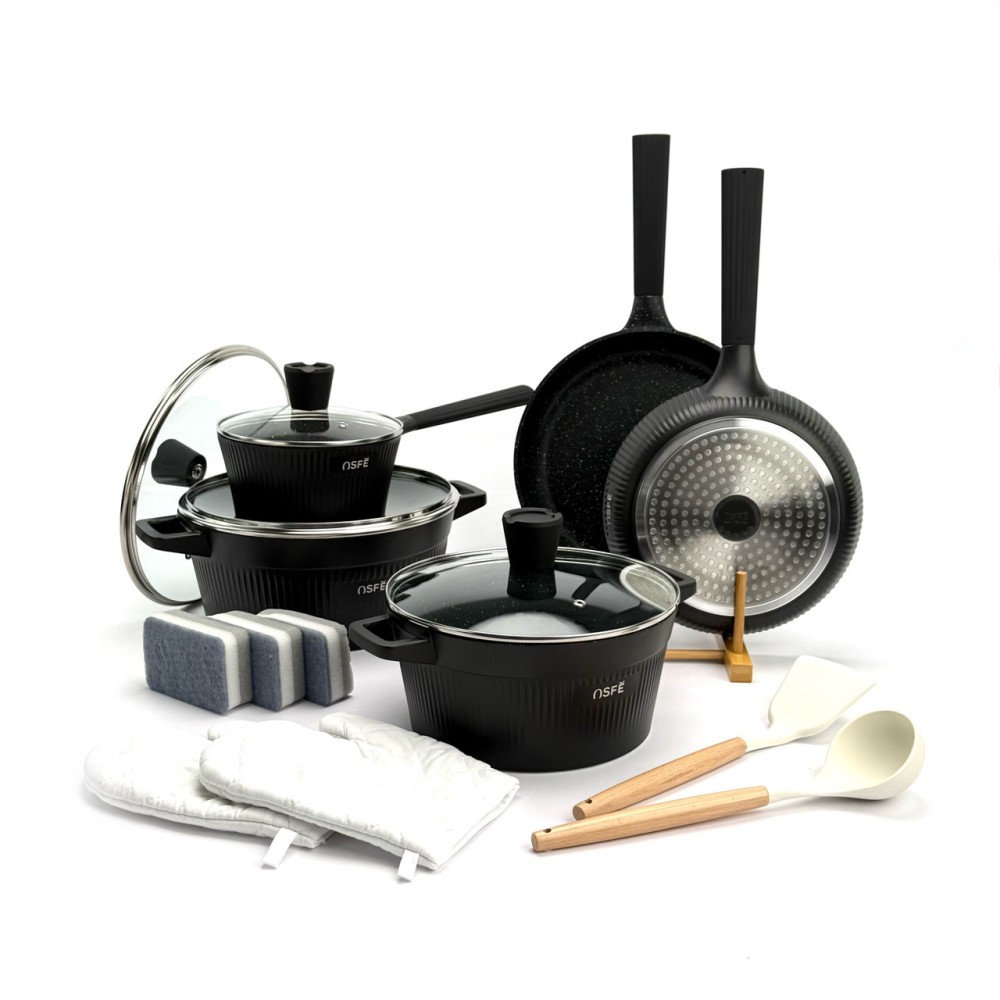 Набор OSFE YD-16 — це ідеальне рішення "все-в-одному" для сучасної кухні. Корпус посуду виготовлений із високоякісного алюмінію з ефектним ребристим дизайном. Внутрішня поверхня покрита довговічним гранітним (мармуровим) антипригарним покриттям, яке дає змогу їжі не пригорати та легко ковзати. Покриття нетоксичне та не містить PFOA, PTFE, PFAS, олива та кадмію, що робить приготування їжі безпечним для здоров'я. Індукційне дно сумісне з усіма типами плит (газовими, електричними, склокерамічними, індукційними). До комплекту входять кришки із загартованого скла, а також повний набір стартових аксесуарів: кухонне приладдя, губки та тканинні прихватки-рукавиці. Переваги Повна комплектація (16-в-1): Містить 4 каструлі/сковороди з кришками, 1 сковороду та 7 аксесуарів. Стильний ребристий дизайн: Унікальний зовнішній вигляд, який прикрасить кухню. Абсолютна безпека: Не містить PFOA, PTFE, PFAS, олива та кадмію. Ультраміцне покриття: Антипригарне покриття для готування без пригорання. Універсальна сумісність: Індукційне дно підходить для всіх типів плит. Продумані аксесуари: До комплекту входить все необхідне, включно з прихватками. Ергономічні ручки: Термостійкі, не нагріваються і зручно лежать у руці. Технічні характеристики Бренд: OSFE Модель: YD-16 Кількість предметів: 16 Колір: Чорний Матеріал корпусу: Алюміній Зовнішній дизайн: Ребристий Покриття: Гранітне (антипригарне) Безпека: PFOA, PTFE, PFAS, Lead, Cadmium FREE Матеріал ручок: Термостійкий пластик (Бакеліт) Матеріал кришок: Загартоване скло Сумісність із плитами: Усі типи, включно з індукційними Габарити упаковки: 61 х 35 х 17 см Вага: 8.5 кг Комплектація набору (16 предметів) Ківш зі скляною кришкою: 18 см Каструля зі скляною кришкою: 24 см Каструля зі скляною кришкою: 28 см Сковорода: 24 см Сковорода зі скляною кришкою: 28 см Кухонні речі (2 шт.) Прихватки-рукавиці (2 шт.) Губки для миття (3 шт.)