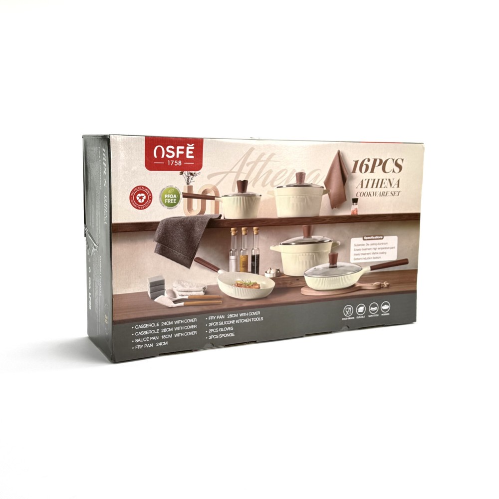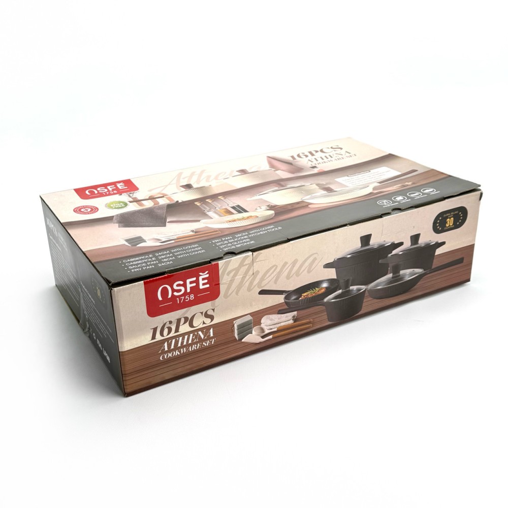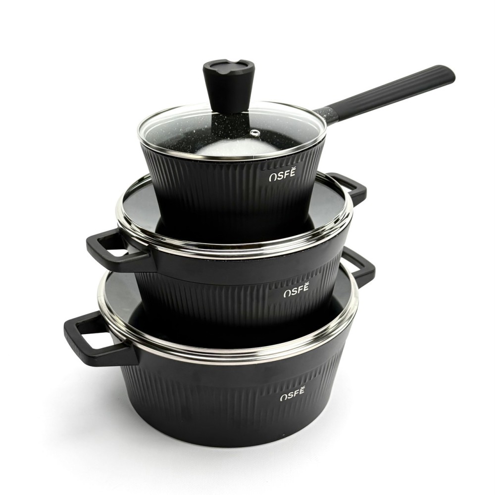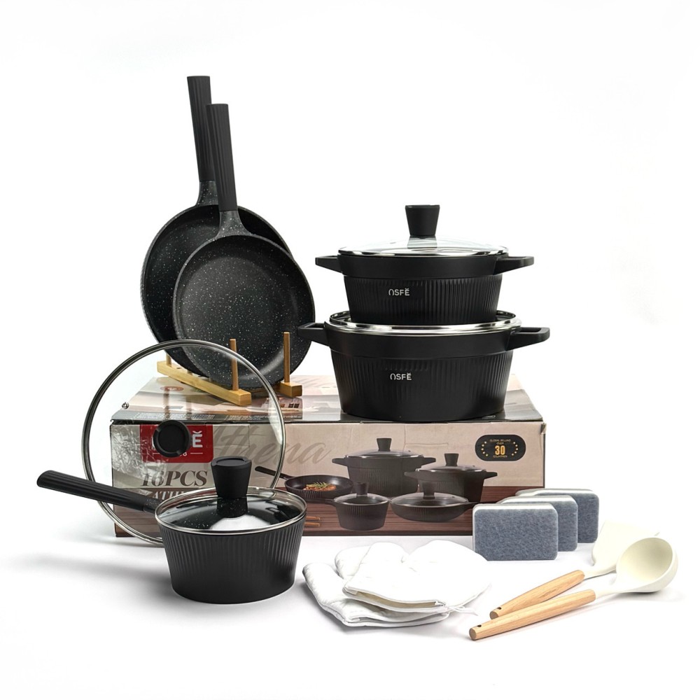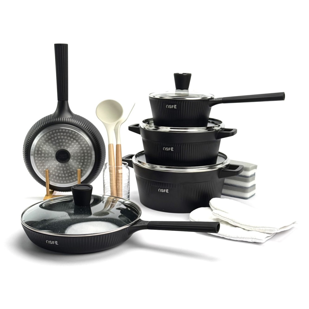 Набор OSFE YD-16 — це ідеальне рішення "все-в-одному" для сучасної кухні. Корпус посуду виготовлений із високоякісного алюмінію з ефектним ребристим дизайном. Внутрішня поверхня покрита довговічним гранітним (мармуровим) антипригарним покриттям, яке дає змогу їжі не пригорати та легко ковзати. Покриття нетоксичне та не містить PFOA, PTFE, PFAS, олива та кадмію, що робить приготування їжі безпечним для здоров'я. Індукційне дно сумісне з усіма типами плит (газовими, електричними, склокерамічними, індукційними). До комплекту входять кришки із загартованого скла, а також повний набір стартових аксесуарів: кухонне приладдя, губки та тканинні прихватки-рукавиці. Переваги Повна комплектація (16-в-1): Містить 4 каструлі/сковороди з кришками, 1 сковороду та 7 аксесуарів. Стильний ребристий дизайн: Унікальний зовнішній вигляд, який прикрасить кухню. Абсолютна безпека: Не містить PFOA, PTFE, PFAS, олива та кадмію. Ультраміцне покриття: Антипригарне покриття для готування без пригорання. Універсальна сумісність: Індукційне дно підходить для всіх типів плит. Продумані аксесуари: До комплекту входить все необхідне, включно з прихватками. Ергономічні ручки: Термостійкі, не нагріваються і зручно лежать у руці. Технічні характеристики Бренд: OSFE Модель: YD-16 Кількість предметів: 16 Колір: Чорний Матеріал корпусу: Алюміній Зовнішній дизайн: Ребристий Покриття: Гранітне (антипригарне) Безпека: PFOA, PTFE, PFAS, Lead, Cadmium FREE Матеріал ручок: Термостійкий пластик (Бакеліт) Матеріал кришок: Загартоване скло Сумісність із плитами: Усі типи, включно з індукційними Габарити упаковки: 61 х 35 х 17 см Вага: 8.5 кг Комплектація набору (16 предметів) Ківш зі скляною кришкою: 18 см Каструля зі скляною кришкою: 24 см Каструля зі скляною кришкою: 28 см Сковорода: 24 см Сковорода зі скляною кришкою: 28 см Кухонні речі (2 шт.) Прихватки-рукавиці (2 шт.) Губки для миття (3 шт.)