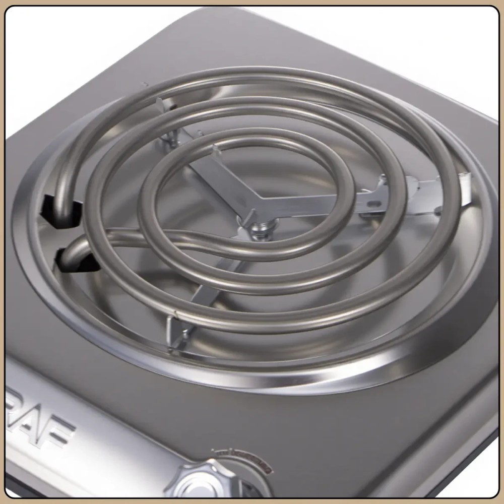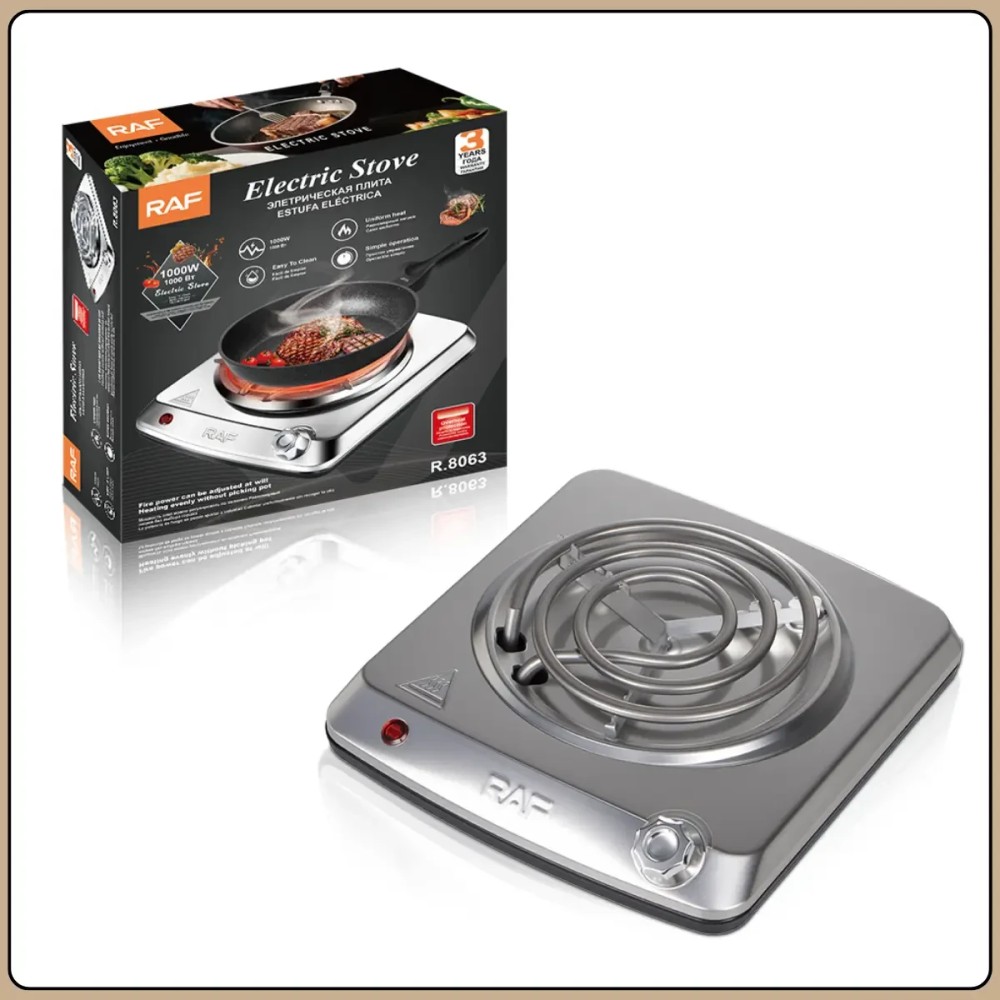 Одноконфоркова електроплита зі спіральним нагрівачем та механічним керуванням RAF R.8063 1000W Електрична плита RAF R.8063 є компактною настільною одноконфорковою моделлю, призначеною для приготування та розігріву їжі в умовах обмеженого простору. Корпус виконаний з нержавіючої сталі, що забезпечує міцність, стійкість до нагрівання та простий догляд. Спіральний нагрівальний елемент діаметром 140 мм забезпечує рівномірне прогрівання посуду та стабільну роботу при повсякденному використанні. Потужність 1000 Вт забезпечує швидке нагрівання та комфортне приготування страв. Керування здійснюється за допомогою поворотного механічного регулятора, що дозволяє точно контролювати рівень нагріву. Пристрій оснащений захистом від перегріву та стійкими ніжками, які запобігають ковзанню та захищають поверхню столу від перегріву. Переваги: Потужність 1000 Вт: швидке розігрів та приготування їжі Одноконфоркова конструкція: компактність та зручність Спіральний нагрівач: рівномірний розподіл тепла Корпус із нержавіючої сталі: міцність та довговічність Механічне керування: простота та надійність Захист від перегріву: безпечна експлуатація Стійкі ніжки: надійна фіксація на поверхні Характеристики: Модель: RAF R.8063 Тип плити: електрична, настільна Кількість конфорок: 1 Тип нагрівального елемента: спіральний Діаметр нагрівача: 140 мм Потужність: 1000 Вт Напруга: 220-240 В Частота: 50-60 Гц Матеріал корпусу: нержавіюча сталь Тип керування: механічне Регулятор температури: поворотний Захист від перегріву: є Розміри: 22×22 см Колір корпусу: сірий