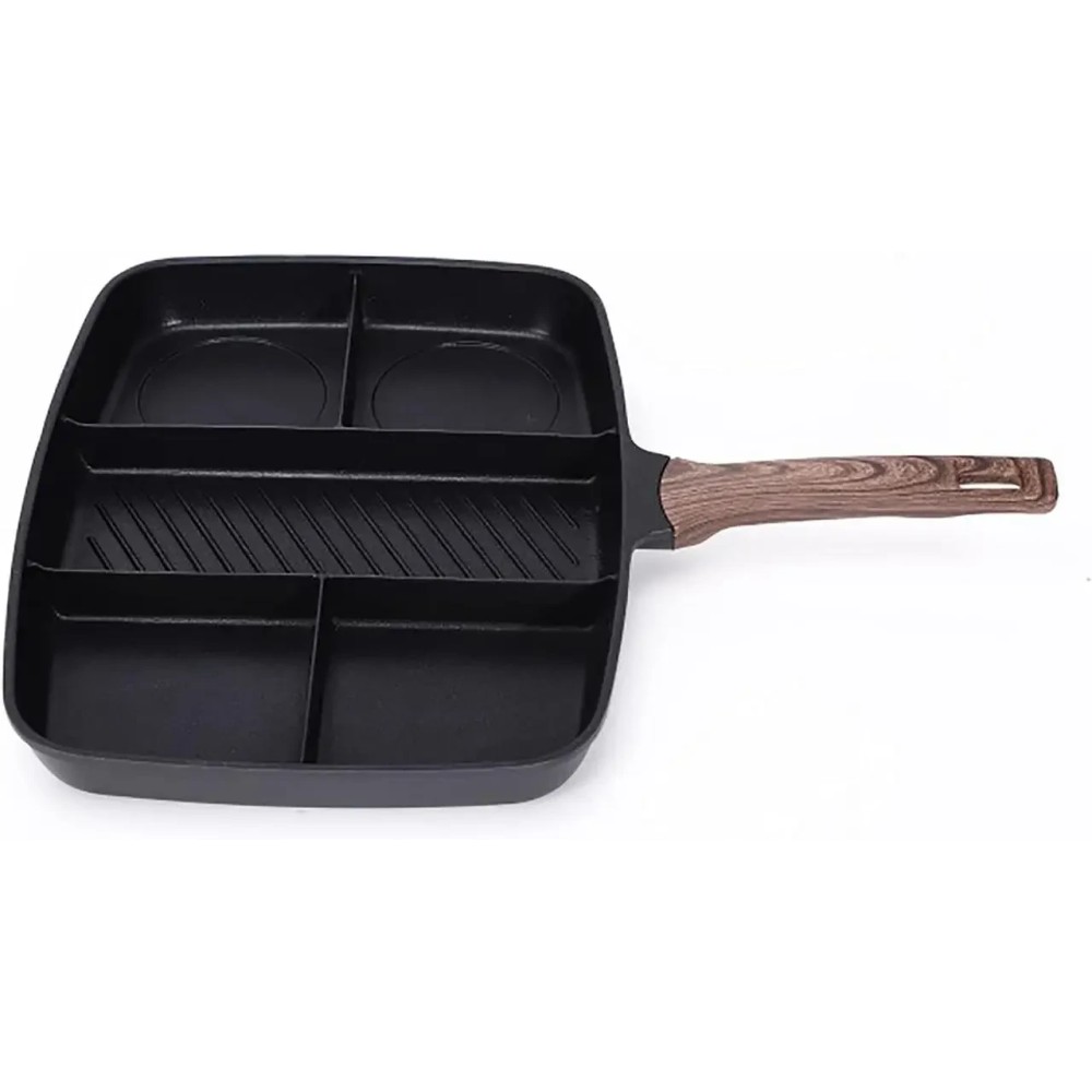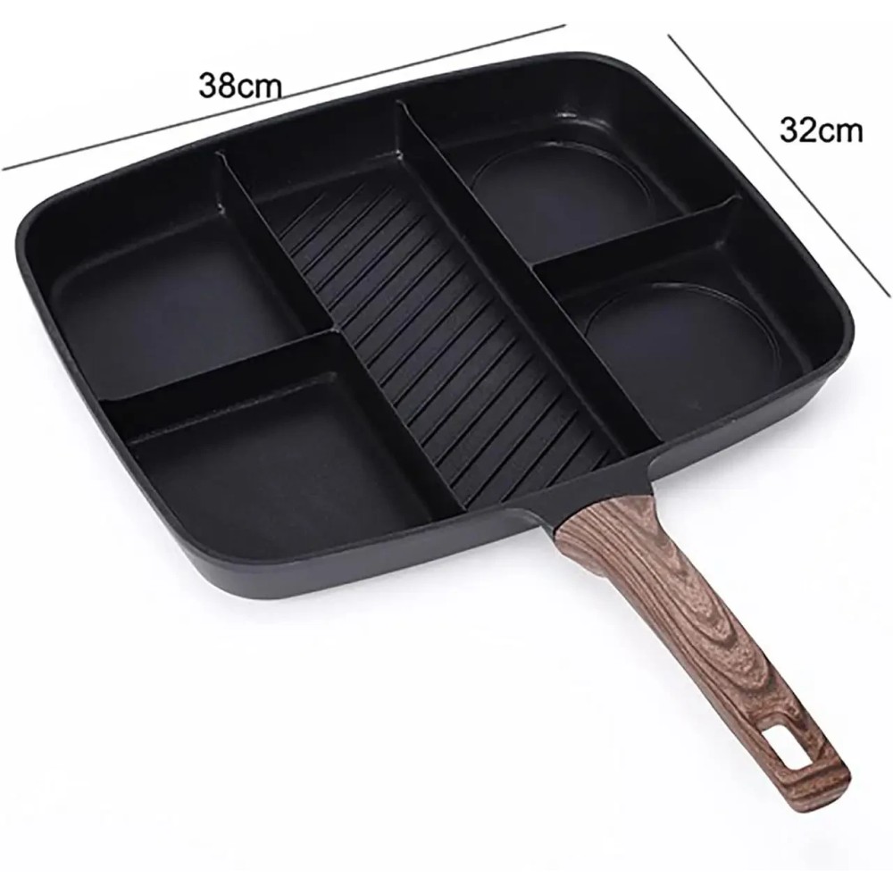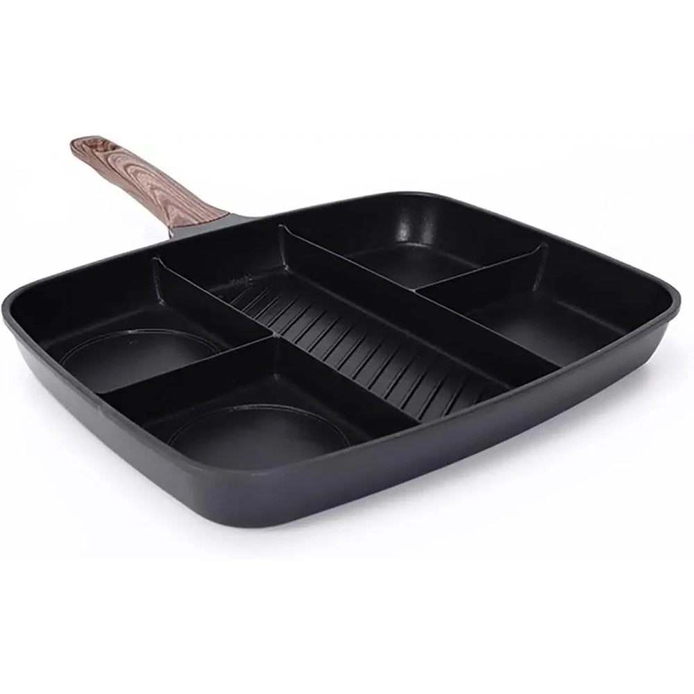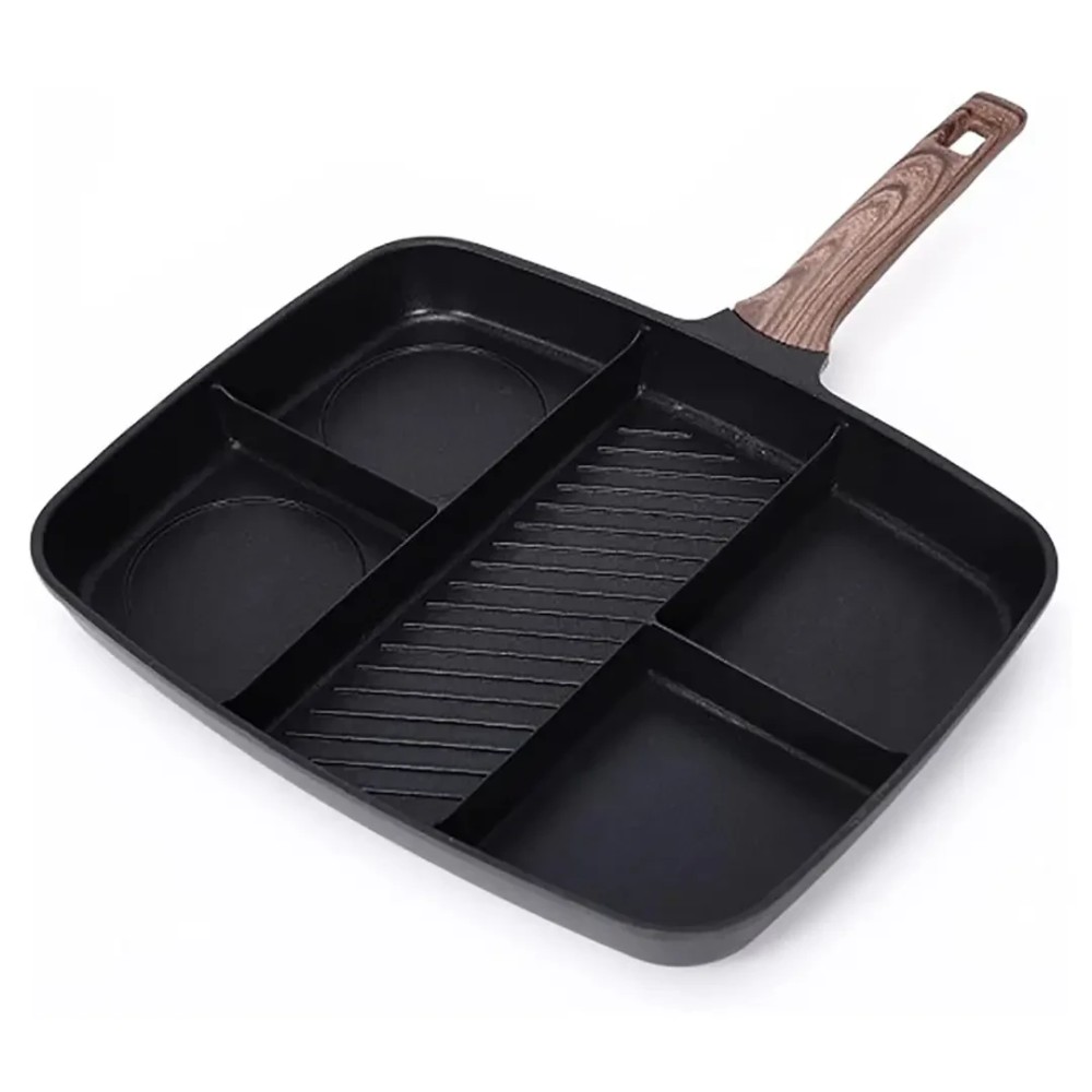 Універсальна сковорода з п'ятьма розділеними секціями й антипригарним покриттям Інноваційна універсальна сковорода — це п'ятисекційний набір, який дасть змогу одночасно приготувати п'ять різних продуктів. Наприклад, смачний, повноцінний сніданок — яєчню, сосиски та олади одночасно. Міцне антипригарне покриття Xylan не виділяє під час нагрівання шкідливих речовин і важких металів. Основа сковорідки оптимально розподіляє тепловий потік: більше в центрі для гриля риби та м'яса, менше з боків для смаження яєць, овочів, млинців тощо. Підходить для всіх різновидів плит, крім індукційних. Сковорода легко миється в посудомийній машині. Переваги: Антипригарне покриття, здорове й безпечне, легко миється. На багатофункціональній сковороді діаметром 2,5 дюйма можна готувати різноманітні страви, заощаджуючи місце. Дно композитного резервуара для збирання тепла має швидке та рівномірне нагрівання. Процес п'ятишарового формування, міцний і довговічний. Підходить для багатьох місць, як-от індукційні, керамічні, газові та електричні плити. Характеристики: Тип: сковорода гриль Матеріал: алюміній Покриття: антипригарне Розмір сковороди: 32 х 38 см