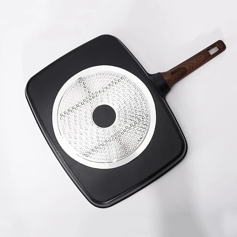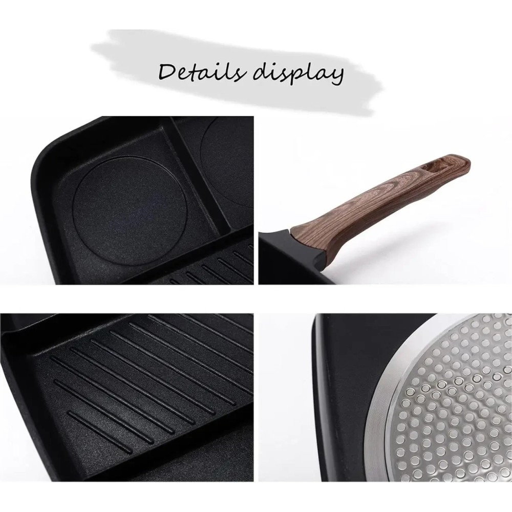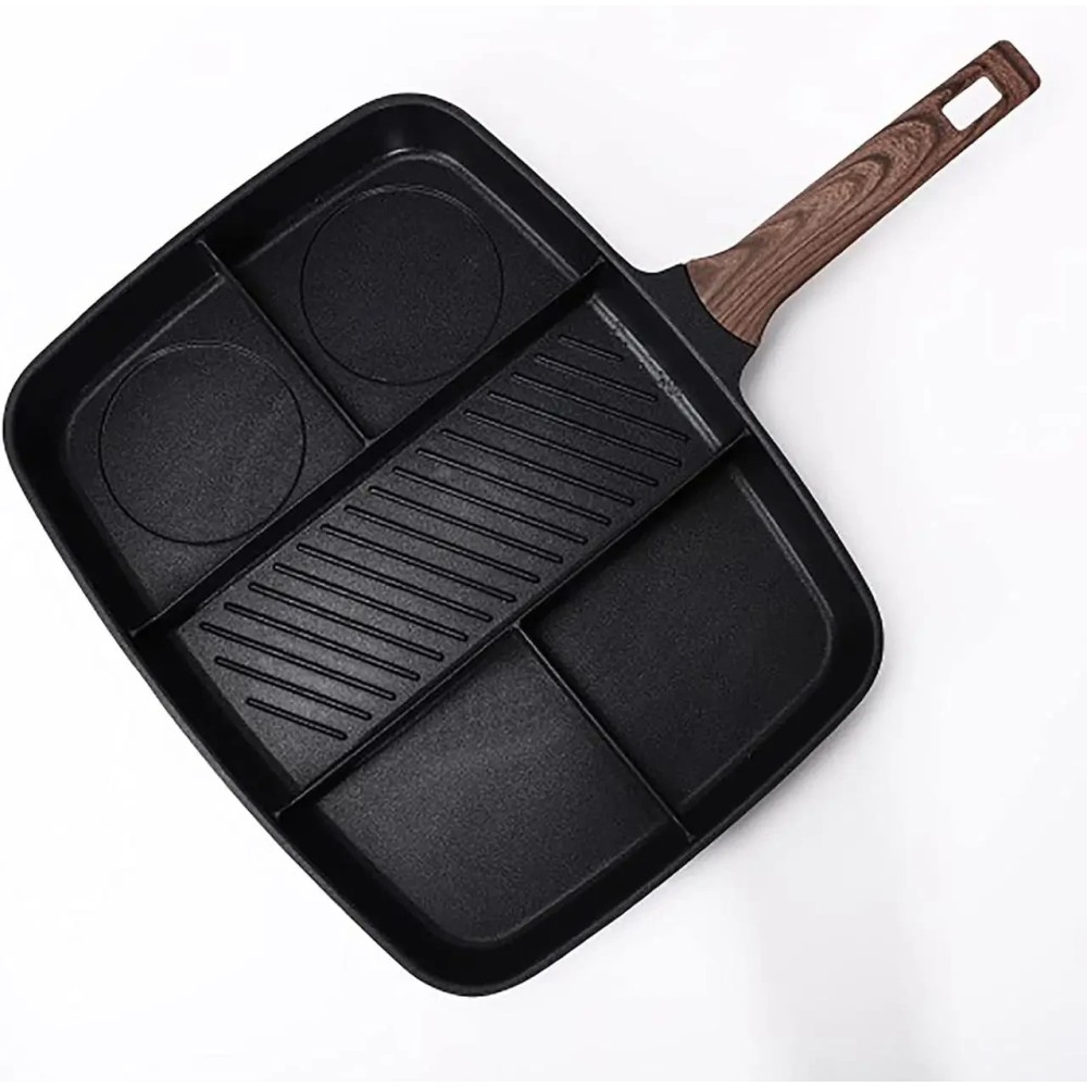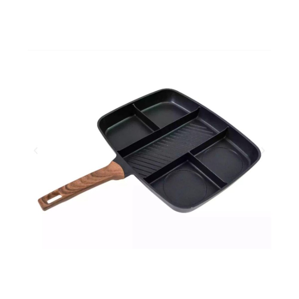 Універсальна сковорода з п'ятьма розділеними секціями й антипригарним покриттям Інноваційна універсальна сковорода — це п'ятисекційний набір, який дасть змогу одночасно приготувати п'ять різних продуктів. Наприклад, смачний, повноцінний сніданок — яєчню, сосиски та олади одночасно. Міцне антипригарне покриття Xylan не виділяє під час нагрівання шкідливих речовин і важких металів. Основа сковорідки оптимально розподіляє тепловий потік: більше в центрі для гриля риби та м'яса, менше з боків для смаження яєць, овочів, млинців тощо. Підходить для всіх різновидів плит, крім індукційних. Сковорода легко миється в посудомийній машині. Переваги: Антипригарне покриття, здорове й безпечне, легко миється. На багатофункціональній сковороді діаметром 2,5 дюйма можна готувати різноманітні страви, заощаджуючи місце. Дно композитного резервуара для збирання тепла має швидке та рівномірне нагрівання. Процес п'ятишарового формування, міцний і довговічний. Підходить для багатьох місць, як-от індукційні, керамічні, газові та електричні плити. Характеристики: Тип: сковорода гриль Матеріал: алюміній Покриття: антипригарне Розмір сковороди: 32 х 38 см