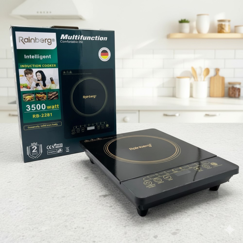 Портативна індукційна плита Rainberg RB-2281 Це компактна та потужна настільна плита з однією конфоркою й потужністю 3500 Вт. Вона використовує індукційну технологію для швидкого та рівномірного нагрівання посуду. Основні характеристики: Модель: Rainberg RB-2281 Потужність: 3500 Вт Тип: Індукційна Кількість конфорок: 1 Поверхня: Ударостійка склокераміка Керування: Цифровий дисплей і великі кнопки Особливості: Захист від перегрівання та стрибків напруги Автоматичне визначення посуду та вимкнення Вбудований вентилятор для охолодження Функції Потужність 3500 ватів Живлення: від мережі 220V Покриття: склокераміка, глянсова Керування: сенсорне Діаметр варильної поверхні 26 см Цифровий дисплей Звуковий сигнал Індикатор браку посуду Автоматичне вимкнення Захист від перегрівання (якщо в каструлі википить вода, плита автоматично вимкнеться) Вбудований вентилятор для охолодження плити Комплектація Настільна індукційна плита Rainberg RB-2281; Інструкція англійською мовою; Заводське паковання;