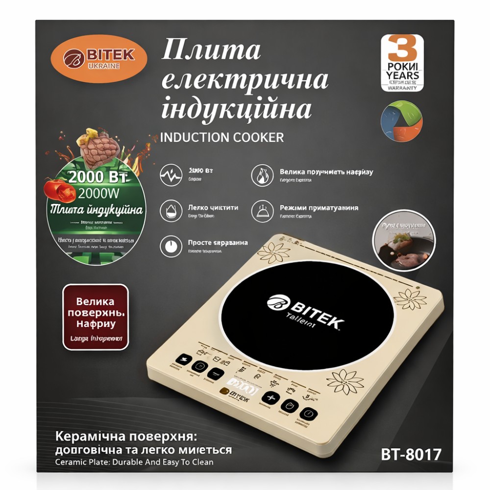 Індукційна електрична плита 1 конфорка BITEK 2000 Вт BT-8017 Сучасна індукційна електрична плита BITEK BT-8017 дозволить вам готувати швидко і з максимальним комфортом. З потужністю 2000 Вт і температурним діапазоном від 80° до 270°, ця плита ідеально підходить як для повільного тушкування, так і для швидкого обсмажування. Її стильний і компактний дизайн дозволить встановити пристрій на будь-якій кухні, не займаючи багато місця. Індукційна технологія гарантує швидке нагрівання, що значно скорочує час приготування страв. Потужність: 2000 Вт Температурний діапазон: 80°–270° Кількість конфорок: 1 Тип управління: сенсорне Компактні розміри, легко зберігати Сумісність з індукційними каструлями Електрична плита BITEK BT-8017 — це відмінний вибір для любителів готувати, шукати нові рецепти та експериментувати на кухні. З нею можна не тільки швидко розігріти їжу, але й приготувати повноцінний обід для всієї родини. Інноваційні технології і стильний дизайн роблять її незамінним помічником на вашій кухні. Обирайте BITEK BT-8017 і насолоджуйтеся якістю та зручністю в щоденному приготуванні!