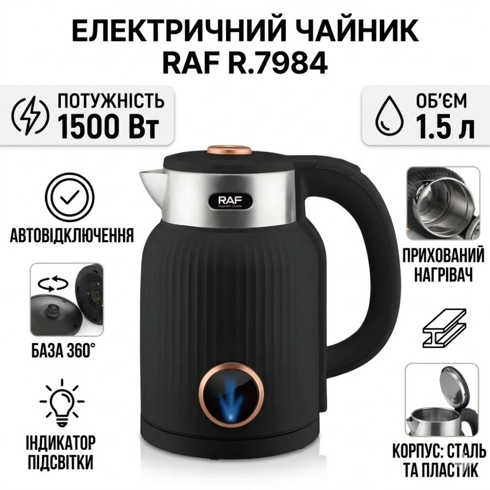 Электрический чайник 1.5 л с автоматическим отключением и поворотной базой 360° RAF R.7984 1500W