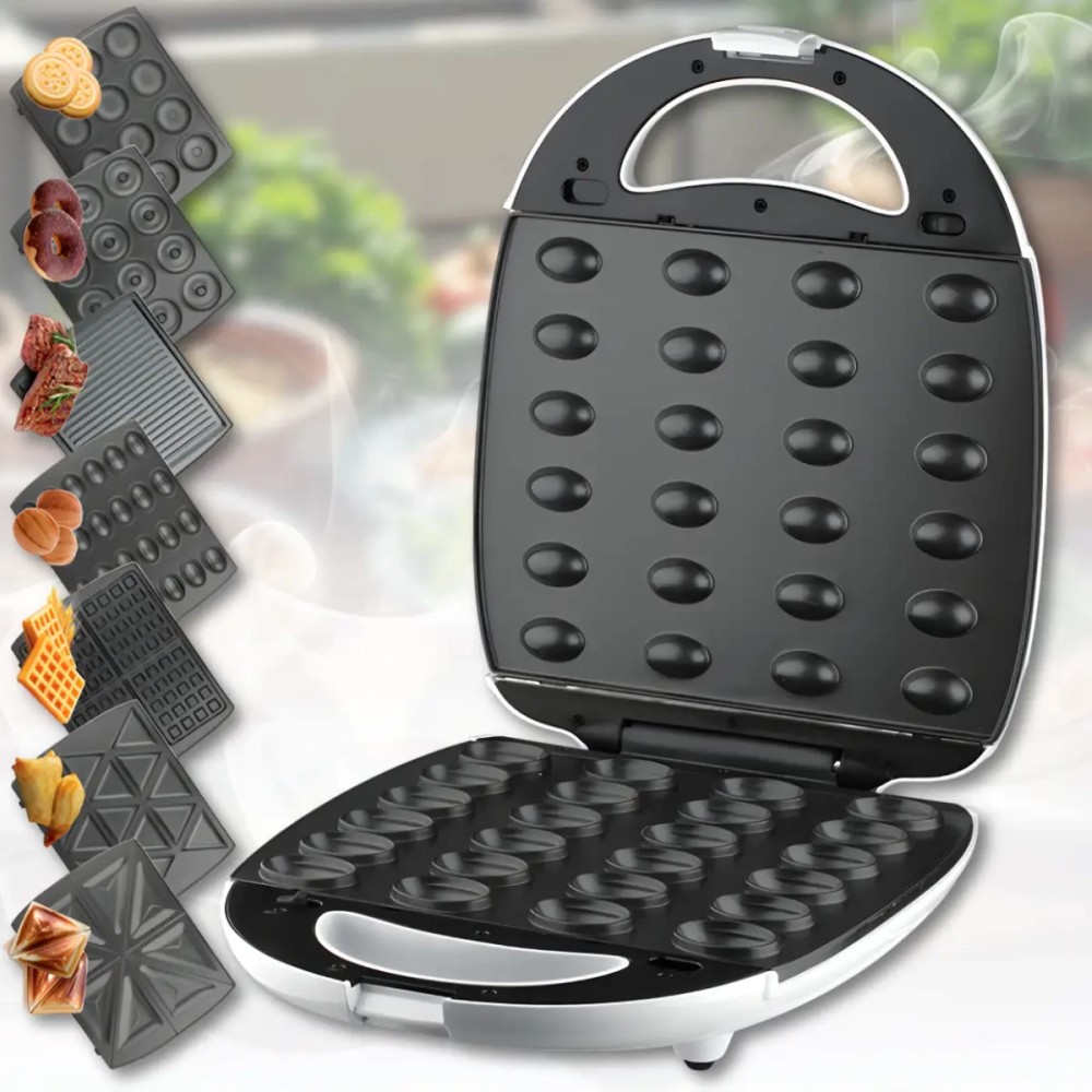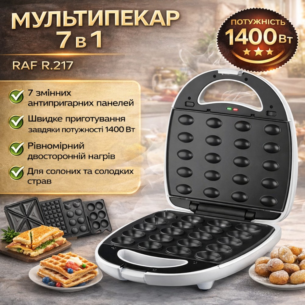 Сендвічниця RAF R.217 - багатофункціональний кухонний пристрій 7в1, призначений для швидкого та зручного приготування різноманітних страв у домашніх умовах. Завдяки потужності 1400 Вт та двостороннему нагріванню пристрій рівномірно прогріває продукти, забезпечуючи стабільний результат при приготуванні сендвічів, вафель, горішків, пончиків, бісквітів та інших десертів. Компактний корпус білого кольору гармонійно вписується в інтер'єр кухні, а індикатор роботи дозволяє легко контролювати процес. Знімні панелі з антипригарним покриттям спрощують догляд за пристроємі запобігають пригоранню продуктів. Сендвічниця розрахована на живлення від мережі 220-240 В з частотою 50-60 Гц і підходить для щоденного використання. Індикатори живлення та готовності до роботи роблять експлуатацію простою та зрозумілою навіть для початківців. Переваги: