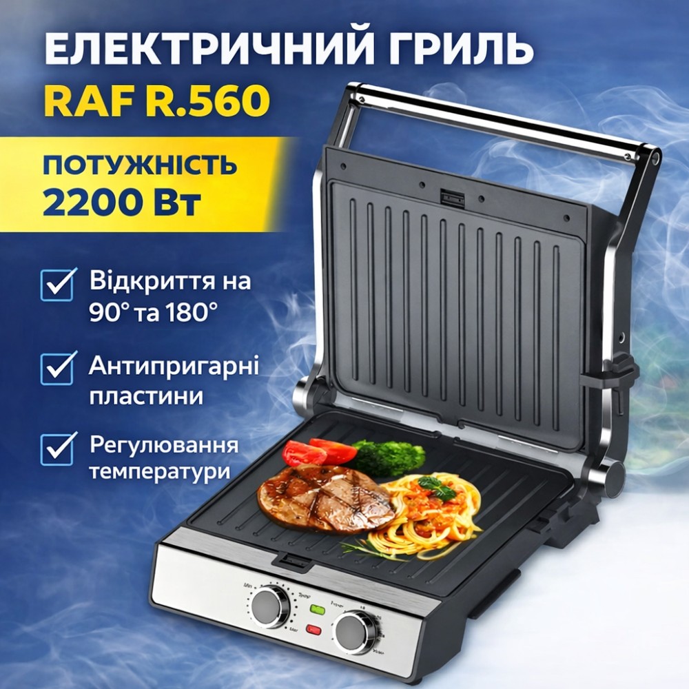Електричний гриль RAF R.560 - це потужний і функціональний контактний гриль,призначений для приготування м'яса, риби, овочів та інших страв у домашніх умовах. Потужність 2200 Вт забезпечує швидкий нагрів і рівномірну прожарку, а антипригарні пластини дозволяють готувати з мінімальною кількістю олії та легко очищаються після використання. Можливість відкриття гриля на 90 і 180 градусів робить його універсальним рішенням як для притискного приготування, так і для використання в режимі барбекю. Корпус виконаний із нержавіючої сталі та міцного АБС-пластику,що забезпечує довговічність і сучасний зовнішній вигляд. Регулювання температури і світлові індикатори роботи дозволяють точно контролювати процес приготування. Термостійкі ручки, захист від перегріву та нековзні ніжки забезпечують безпечну і зручну експлуатацію приладу на кухні. Переваги: