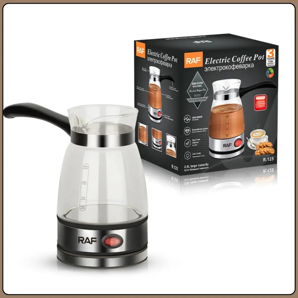 Електрична турка RAF R.125 призначена для швидкого та зручного приготування молотої кави вдома, в офісі чи в дорозі. Формат електричної турки дозволяє за кілька хвилин приготувати насичений та ароматний напій без зайвих зусиль. Компактні розміри роблять прилад зручним для зберігання та транспортування, а сучасний дизайн добре вписується в будь-яке оточення. Корпус виконаний з боросилікатного скла та нержавіючої сталі,що забезпечує довговічність та стійкість до високих температур. Кофеварка оснащена автоматичним відключенням при кипінні, індикатором роботи та ручкою, яка не нагрівається, для безпечного використання. Об'єму 0,5 літра достатньо для приготування до чотирьох порцій кави за один цикл. Переваги:- Швидке приготування: кава готова за кілька хвилин