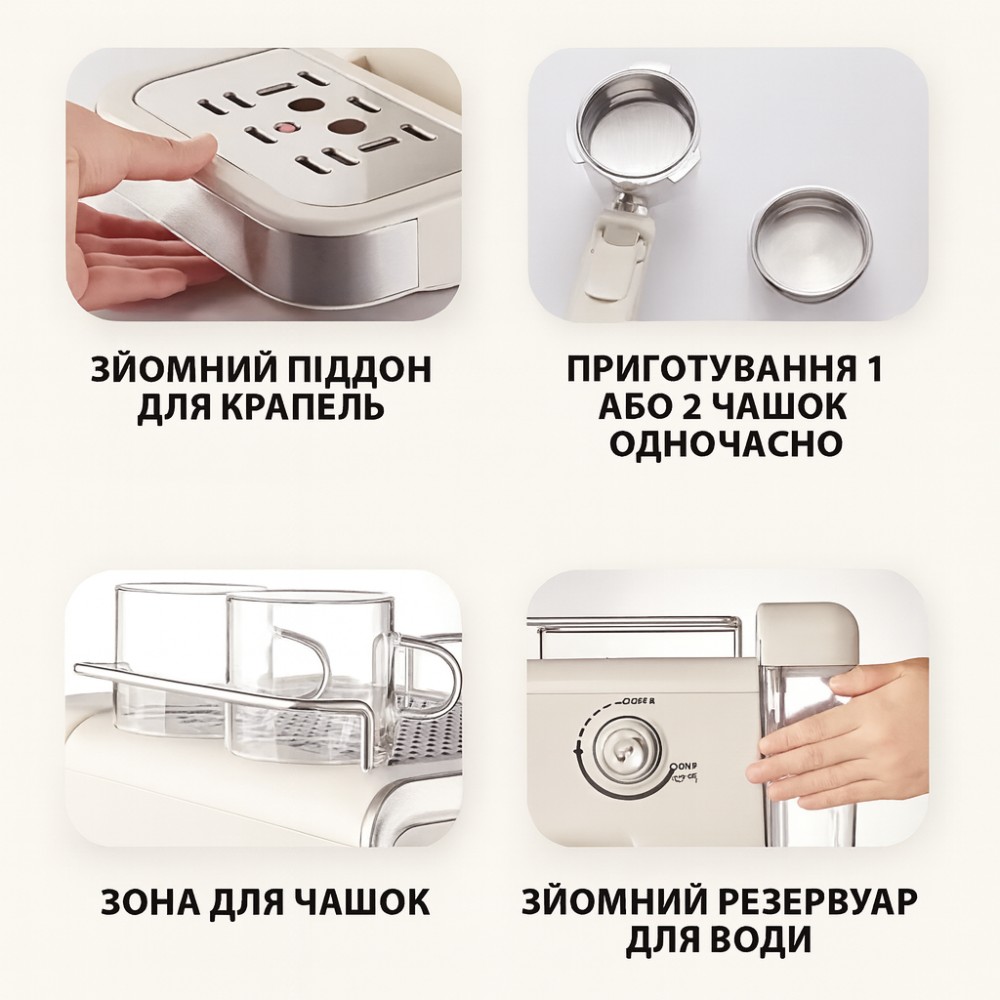 Машина виглядає масивно, але зручна. Усе продумано: бачок легко знімається, піддон швидко миється. Капучинатор крутиться в різні боки — можна підлаштувати під будь-яку чашку.