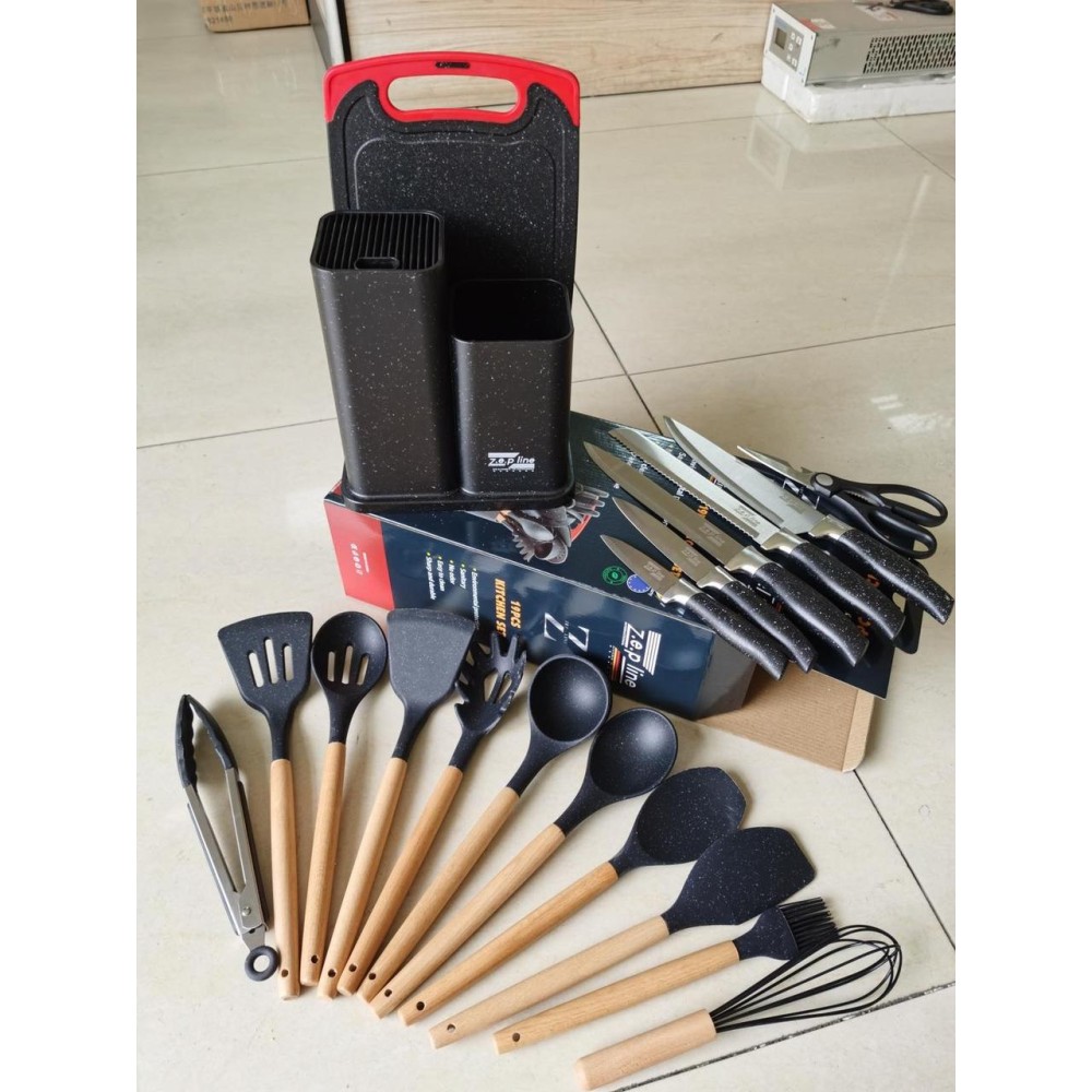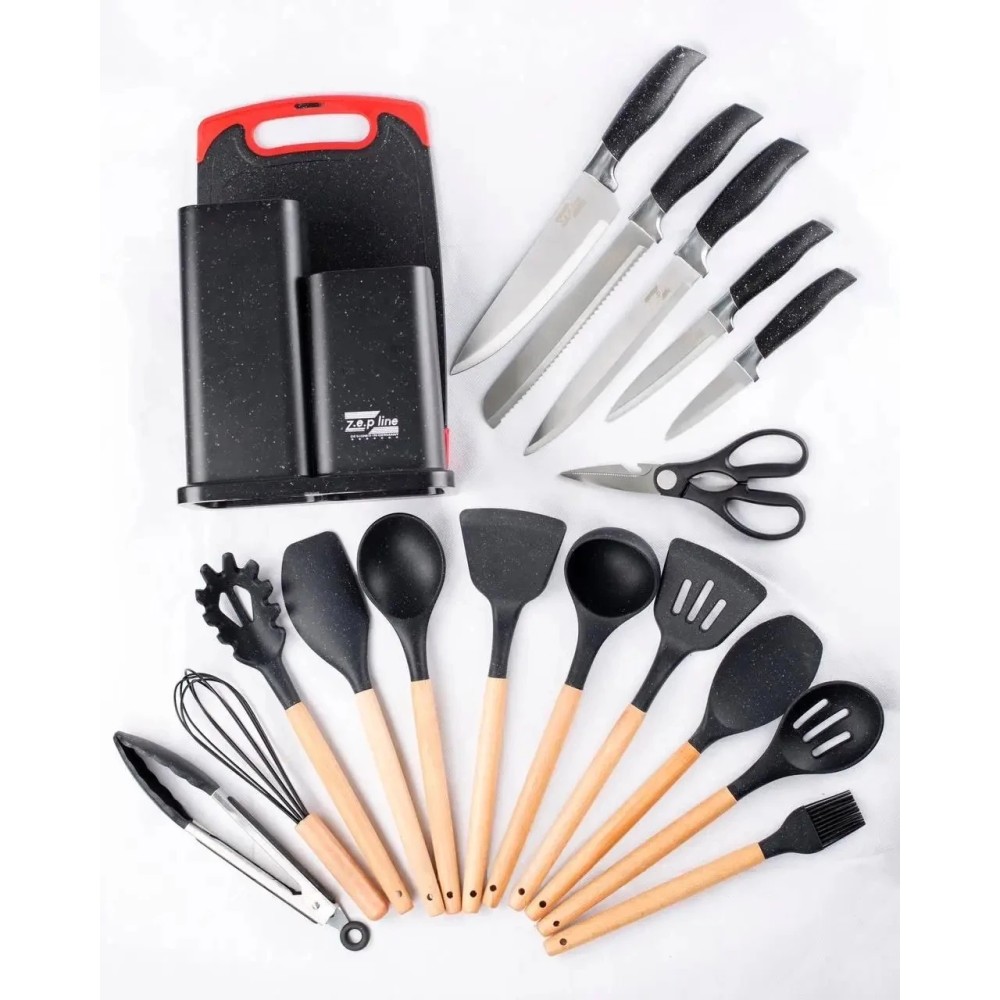 Набір ножів і кухонного приладдя Zepline ZP-067 – незамінний надійний помічник на Вашій кухні.До цього набору входить 5 ножів, розробна дошка, кухонне приладдя на підставці. Набір ножів виготовлений з високоякісної нержавіючої сталі з лазерним загостренням, ручка не ковзає і приємна на дотик. Набір кухонного приладдя виготовлений з харчового, термостійкого силікону.Він безпечний для використання з харчовими продуктами, не токсичний, без запахів, витримує температуру до 230 °C. З таким набором приготування їжі буде приносити задоволення, а також він впишеться в будь-який інтер'єр кухні! Особливості: