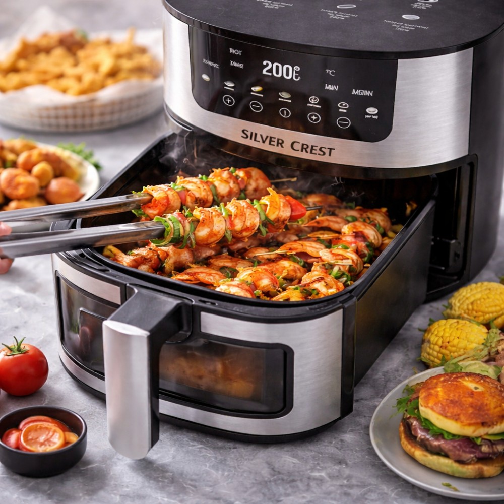 Опис Потужний аерогриль Silver Crest SC-8855S об'ємом 8 літрів — ідеальне рішення для великої сім'ї або компанії. Готуйте смачні та корисні страви з мінімальною кількістю олії завдяки технології Hot Air (гарячий повітря циркулює рівномірно і швидко обсмажує продукти). Корпус з нержавіючої сталі та чорного скла виглядає стильно та сучасно. Великий сенсорний дисплей з яскравим підсвічуванням та зрозумілими іконками, зручне управління кнопками + і -, таймер до 60 хвилин, температура від 80 до 200 °C. Все управління українською (іконки інтуїтивні). Основні переваги: