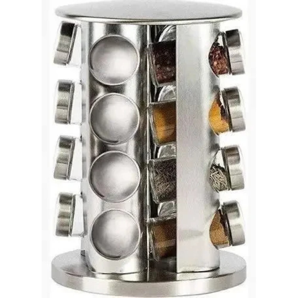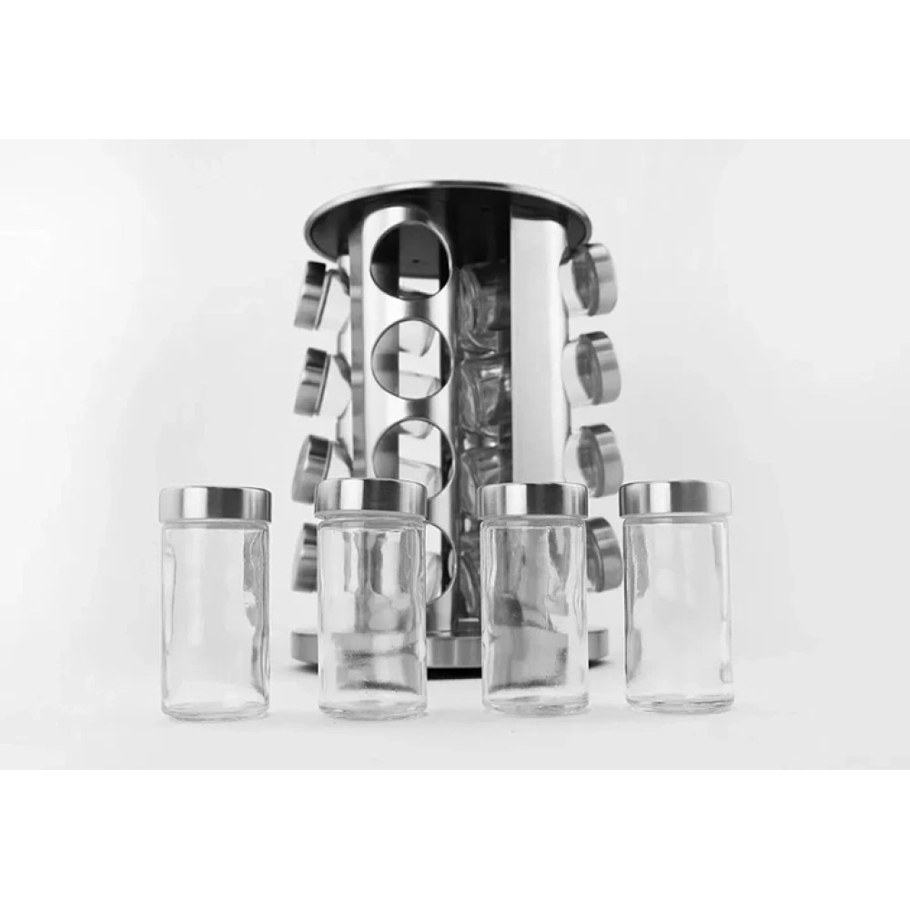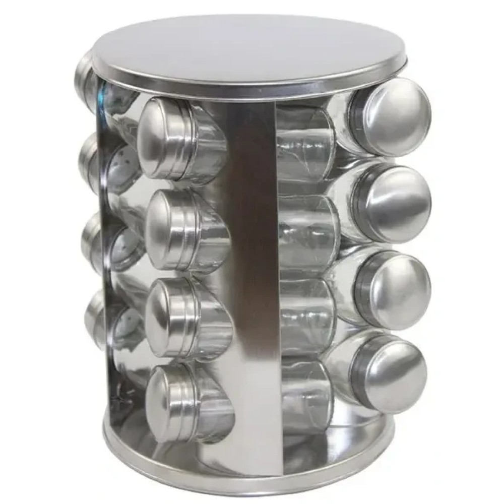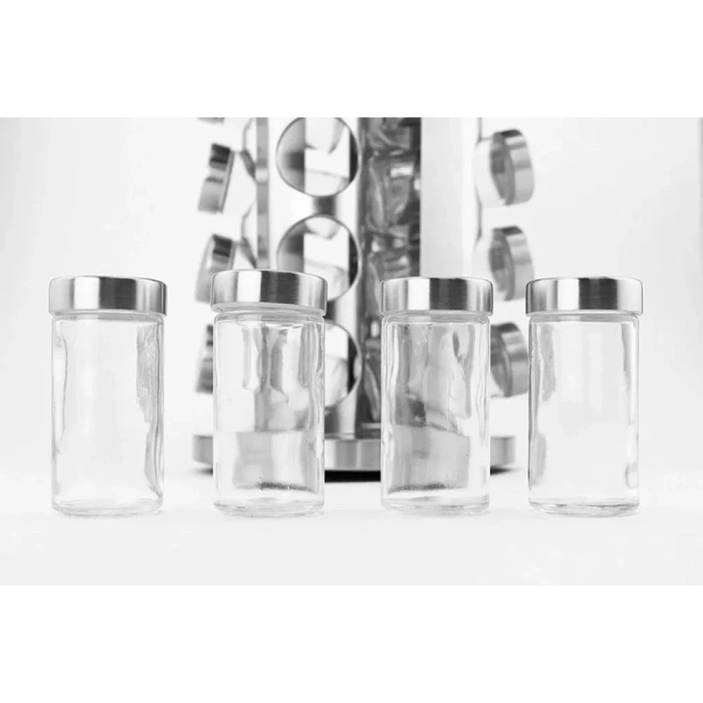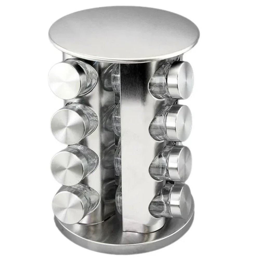 Набір для спецій Spice Carousel, до якого входить 16 ємностей, допоможе вам знайти зручне місце для різних спецій, солі та цукру. Для виробу характерний красивий, сучасний дизайн, завдяки якому він впишеться в інтер'єр будь-якої, навіть дуже вишуканої кухні. Підставка для спецій виготовлена з нержавіючої сталі і може обертатися по колу, що дуже зручно і практично. Ємності виготовлені зі скла, а кришки до них – з нержавіючої сталі. Баночки щільно і надійно закриваються, завдяки чому ароматні приправи не втратять свої властивості та запах. Ємності мають зручну круглу форму. Набір легко миється після використання. Основні характеристики: