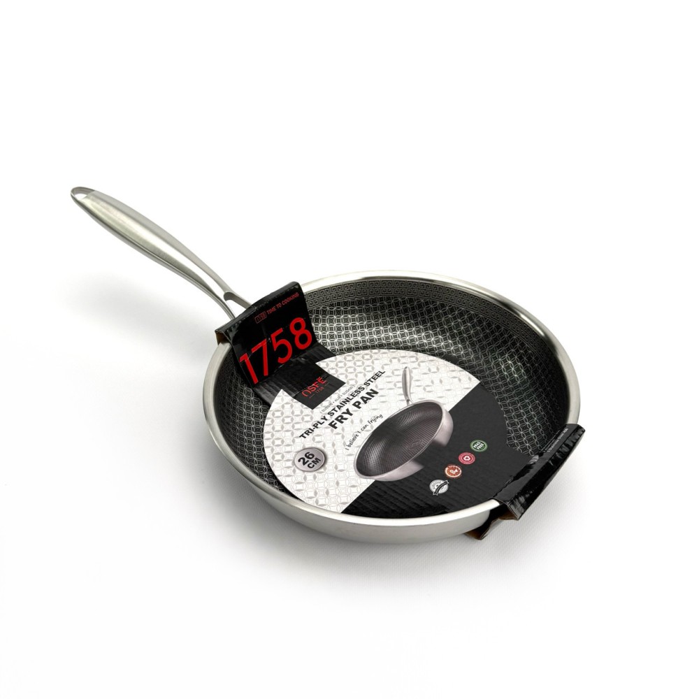 Сковорода OSFE EB-7526 створена для тих, хто шукає безкомпромісну якість. Її головна особливість — гібридна внутрішня поверхня: на антипригарний шар (PFAS Free) нанесена сітка з неіржавкої сталі. Ця сталева сітка захищає антипригарний шар від пошкоджень, даючи змогу використовувати навіть металеві аксесуари та забезпечує чудовий розподіл олії. Корпус сковороди виготовлений за професійною тришаровою технологією Tri-Ply: Внутрішній шар: Харчова неіржавка сталь SUS316 — гігієнічна, довговічна та нетоксична. Середній шар: Алюміній — гарантує миттєве й ідеально рівномірне нагрівання по всій поверхні. Зовнішній шар: Магнітна неіржавка сталь SUS430 — забезпечує сумісність з усіма типами плит, включно з індукційними. Товстий корпус чудово проводить тепло, а міцна сталева ручка забезпечує надійне схоплення. Переваги Гібридне покриття: Поєднує антипригарні властивості та неймовірну стійкість до подряпин. Тришаровий корпус Tri-Ply: Гарантує швидке та рівномірне нагрівання без "гарячих точок". Преміальна сталь 316: Внутрішній шар абсолютно безпечний, не виділяє токсинів і довговічний. Виняткова міцність: Стійка до деформації та пошкоджень. Універсальна сумісність: Підходить для газових, електричних, склокерамічних та індукційних плит. Безпека: Не містить PFAS (пер- і поліфторкальних речовин). Рекомендації щодо догляду Для продовження терміну експлуатації рекомендується ручне миття. Не ставте розпечену сковороду під холодну воду, дайте їй охолонути. Щоб уникнути точкової корозії, додавайте сіль до вже гарячої води або страви. Не використовуйте для чищення абразивні засоби (наприклад, з хлором) або жорсткі металеві губки. Технічні характеристики Артикул: EB-7526 Бренд: OSFE Діаметр: 26 см Габаритні розміри (з ручкою): 49 х 28 х 8 см Матеріал корпусу: Неіржавка сталь (Трьохшаровий Tri-Ply: SUS316 + Алюміній + SUS430) Покриття: Гібридне (сталева сітка + антипригарний шар PFAS Free) Кришка: Немає Сумісність із плитами: Усі типи, включно з індукційними Комплектація Сковорода 26 см (без кришки)