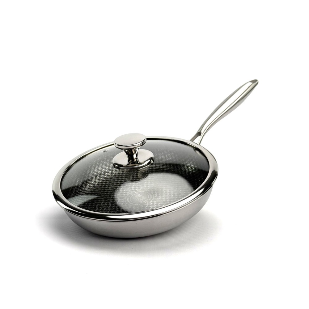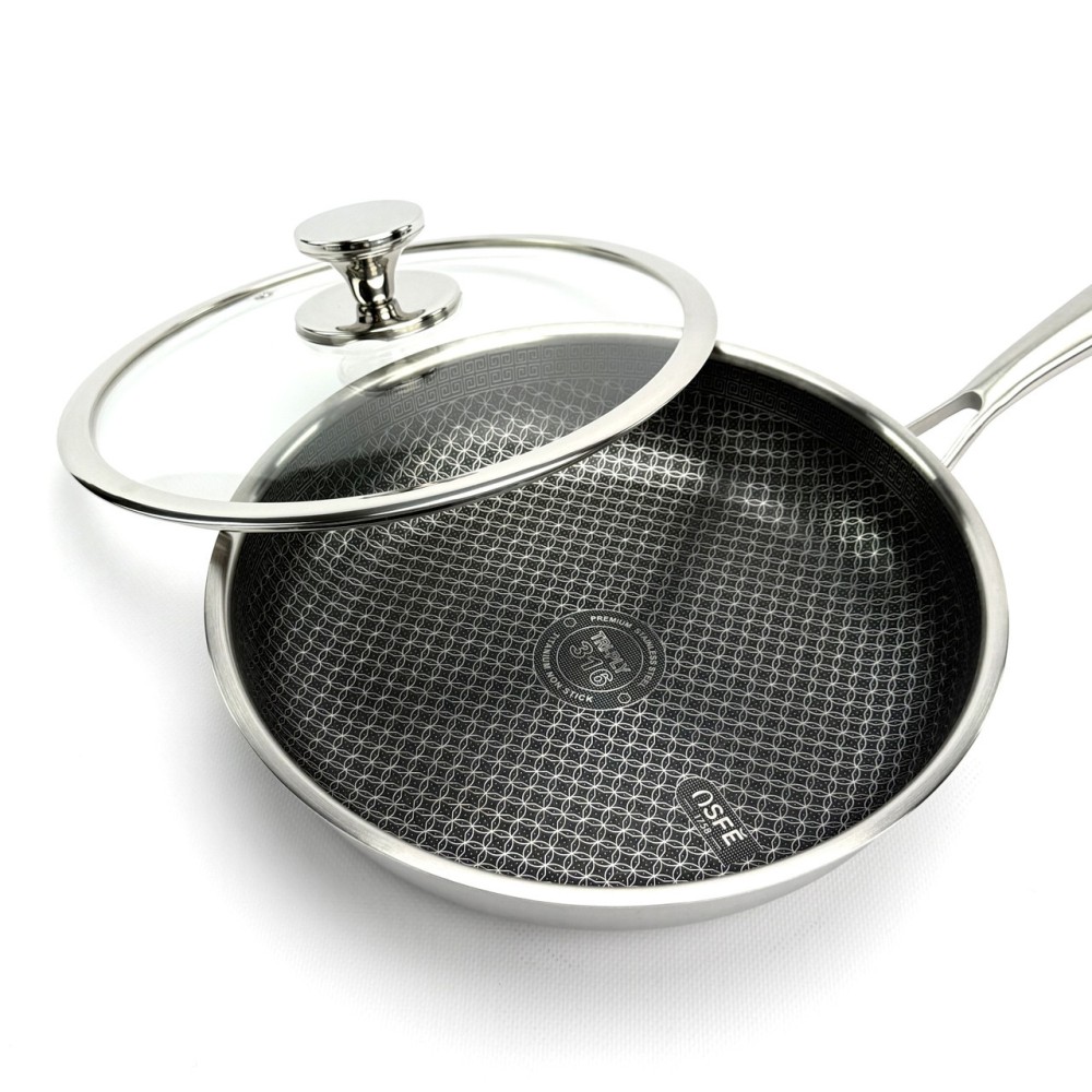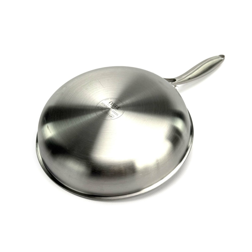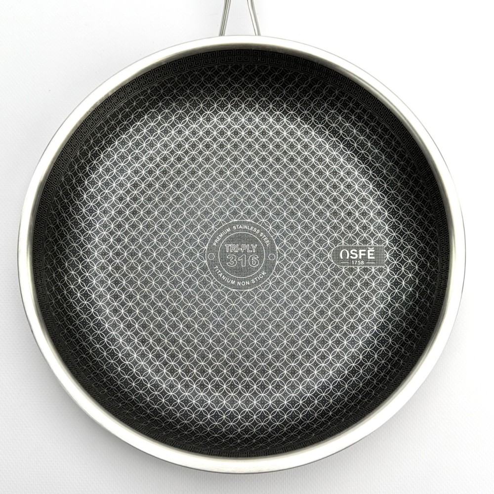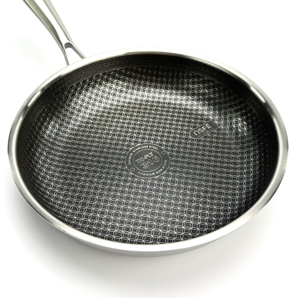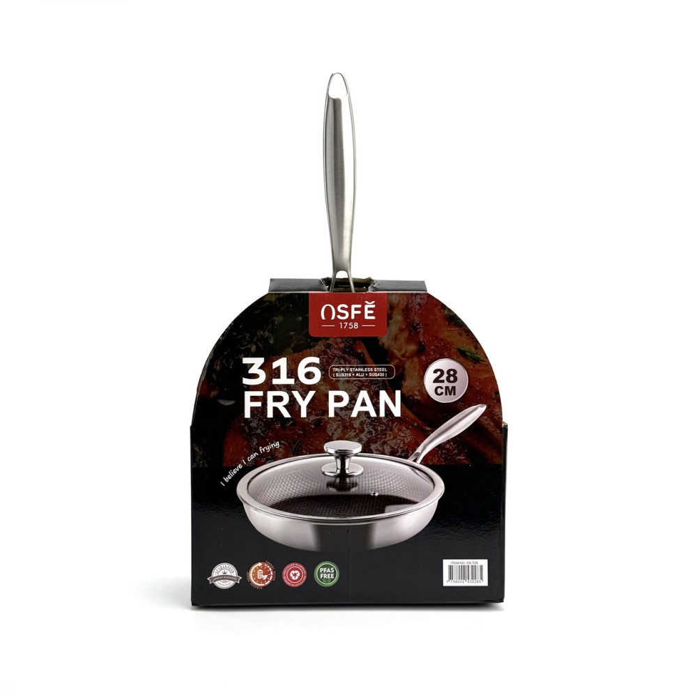 Сковорода OSFE OS-T28 — це революційне рішення для вашої кухні. Внутрішня поверхня виготовлена за гібридною технологією: на антипригарний шар нанесена сітка з неіржавкої сталі у формі бджолиних стільників. Ця сталева сітка захищає антипригарне покриття від пошкоджень навіть під час використання металевих лопаток, а також забезпечує чудовий розподіл оливи для ідеальної золотистої скоринки. Корпус сковороди виготовлений за тришаровою технологією Tri-Ply: Внутрішній шар: Харчова неіржавка сталь марки SUS316 — винятково міцна, гігієнічна та стійка до корозії. Середній шар: Алюміній — забезпечує швидкий і, що найголовніше, рівномірне нагрівання по всій поверхні сковороди, від дна до стінок. Зовнішній шар: Неіржавка сталь SUS430 — має магнітні властивості, що робить сковороду сумісною з усіма типами плит, включно з індукційними. Сковорода не містить PFOA, що робить її абсолютно безпечною для вашого здоров'я. До комплекту входить кришка із загартованого скла, що дає змогу контролювати процес приготування. Переваги Гібридне покриття: Поєднує антипригарні властивості та неймовірну стійкість до подряпин. Можна використовувати металеві аксесуари. Тришаровий корпус Tri-Ply: Гарантує швидке та рівномірне нагрівання без "гарячих точок". Високоякісна сталь 316: Внутрішній шар абсолютно безпечний, не виділяє шкідливих речовин і довговічний. Універсальна сумісність: Підходить для газових, електричних, склокерамічних та індукційних плит. Безпека для здоров'я: Покриття не містить PFOA (перфтороктанової кислоти). Легкість у догляді: Легко миється завдяки поєднанню сталі й антипригарних властивостей. Рекомендації щодо догляду Рекомендується ручне миття для збереження ідеального зовнішнього вигляду та продовження терміну експлуатації. Уникайте різких перепадів температур (не ставте розпечену сковороду під холодну воду). Щоб уникнути точкової корозії, додавайте сіль до вже гарячої води або страви. Не використовуйте абразивні очисні засоби (наприклад, з хлором), щоб не пошкодити захисний шар сталі. Технічні характеристики Артикул: OS-T28 Бренд: OSFE Діаметр: 28 см Габаритні розміри (з ручкою): 53 х 31 х 11 см Матеріал корпусу: Тришаровий Tri-Ply (SUS316 + Алюміній + SUS430) Покриття: Гібридне (сталева сітка + антипригарний шар PFOA Free) Кришка: Загартоване скло з ручкою з неіржавкої сталі Сумісність із плитами: Усі типи, включно з індукційними Комплектація Сковорода 28 см Скляна кришка